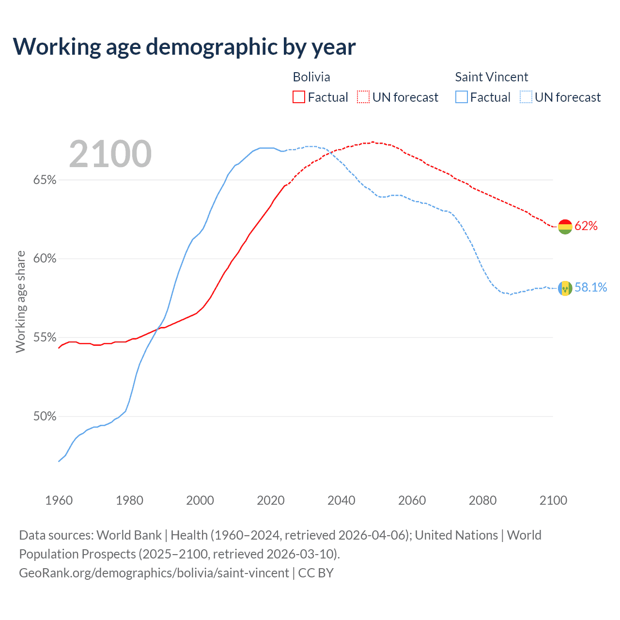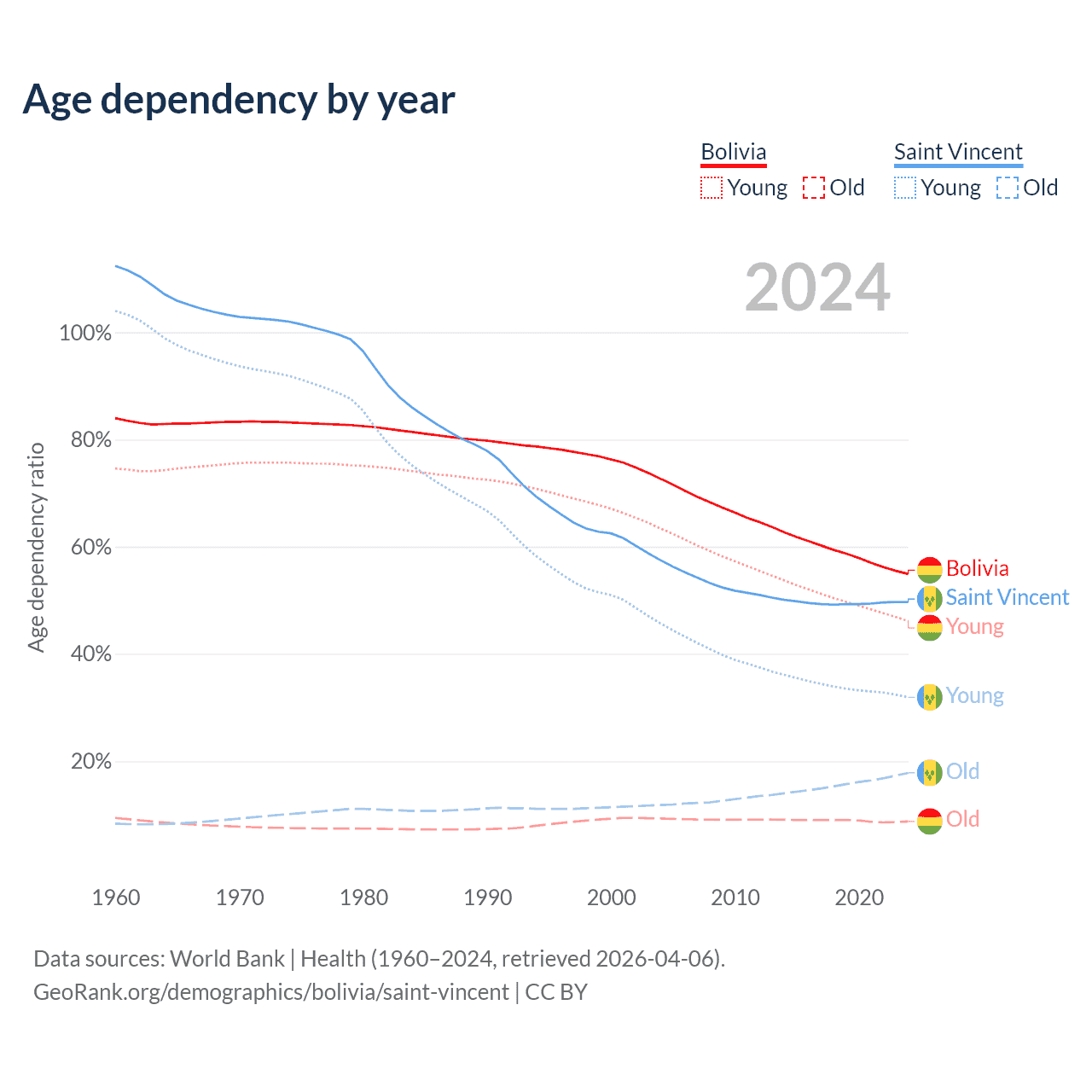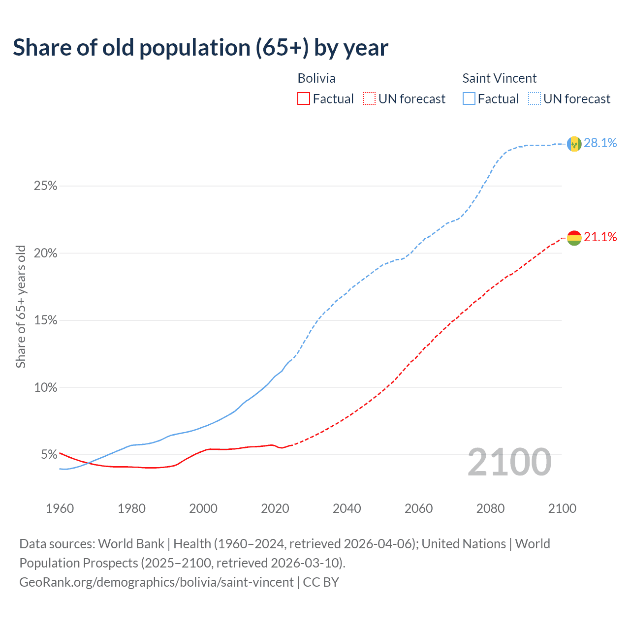 - The share of old-age demographic (65+) in Bolivia is 5.64% vs 11.9% in Saint Vincent.