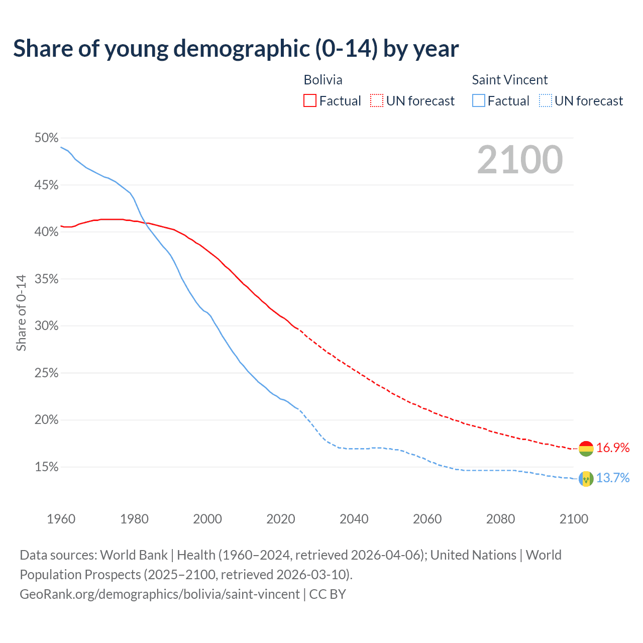 - The share of young demographic (0-15 years old) in Bolivia is 29.8% vs 21.3% in Saint Vincent.