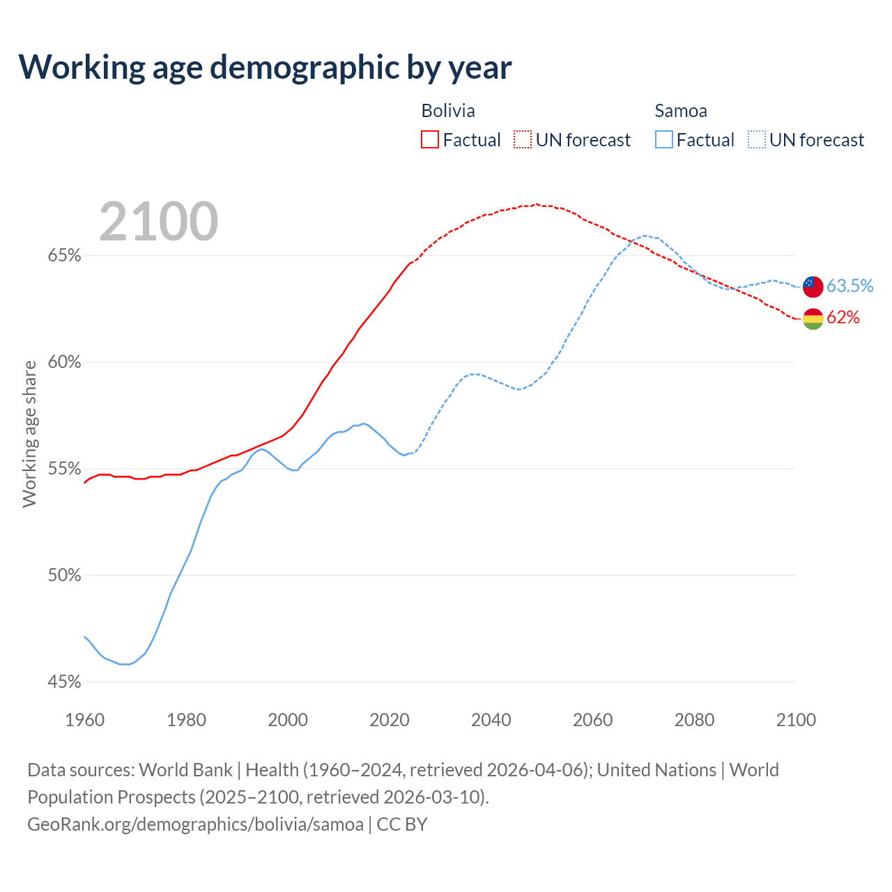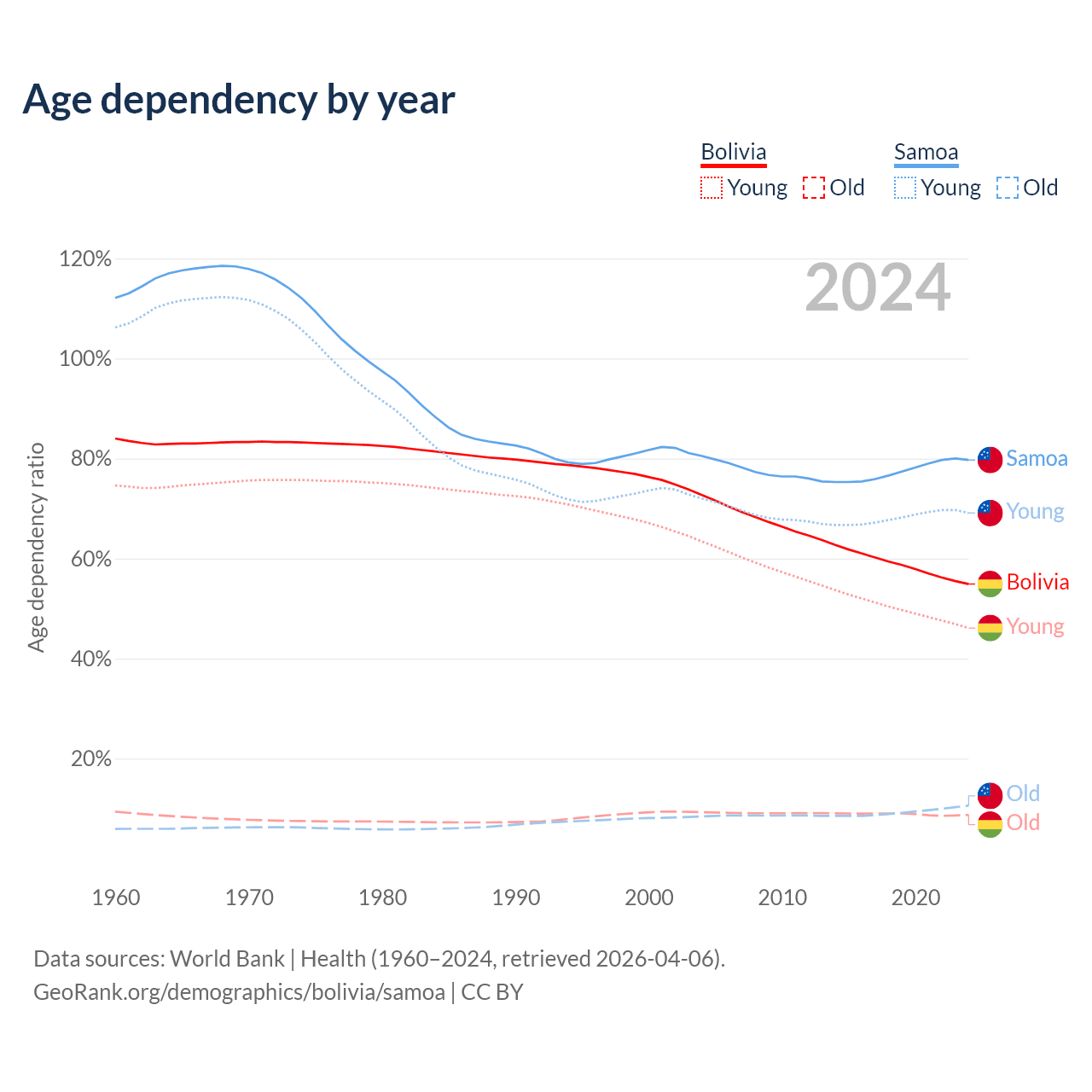 - The share of old-age demographic (65+) in Bolivia is 5.64% vs 5.88% in Samoa.