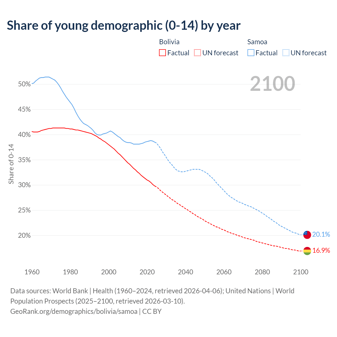 - The share of young demographic (0-15 years old) in Bolivia is 29.8% vs 38.5% in Samoa.