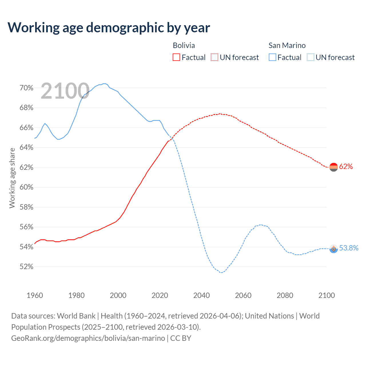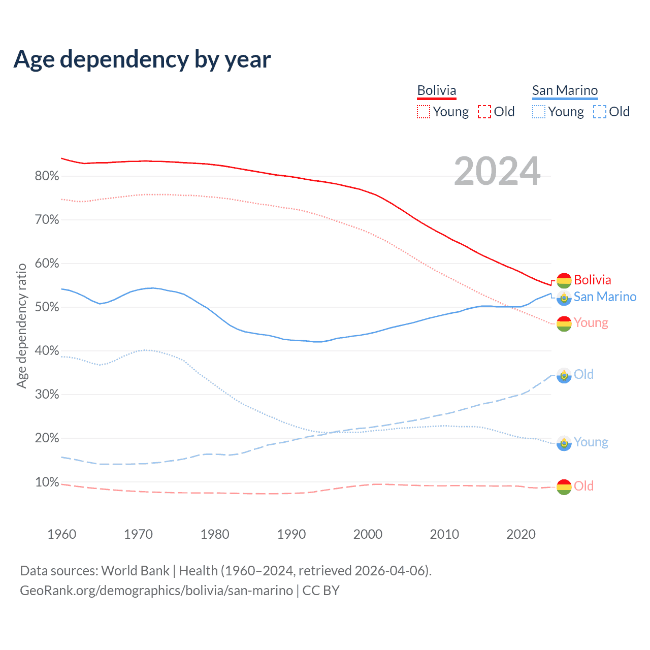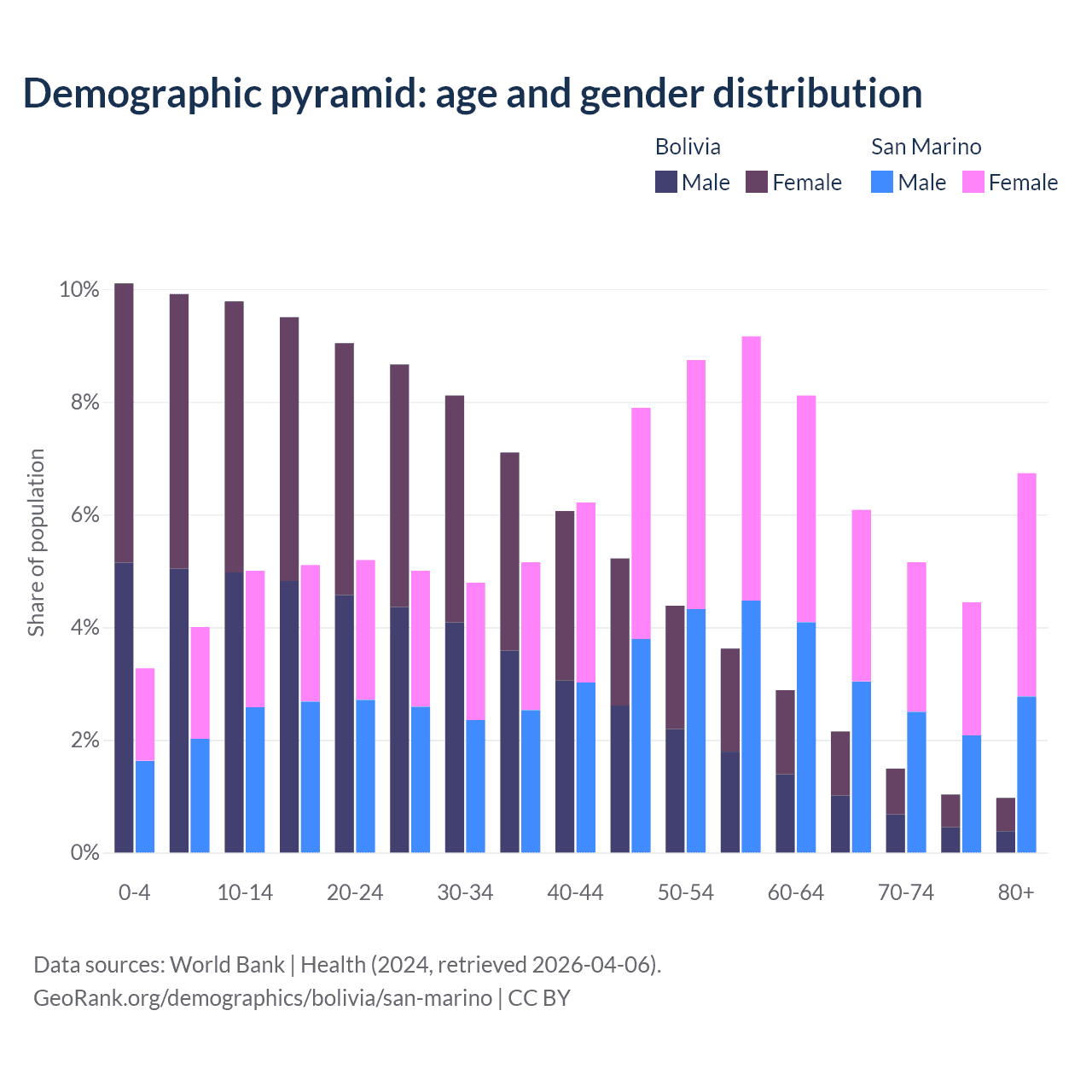 - The share of old-age demographic (65+) in Bolivia is 5.64% vs 22.4% in San Marino.