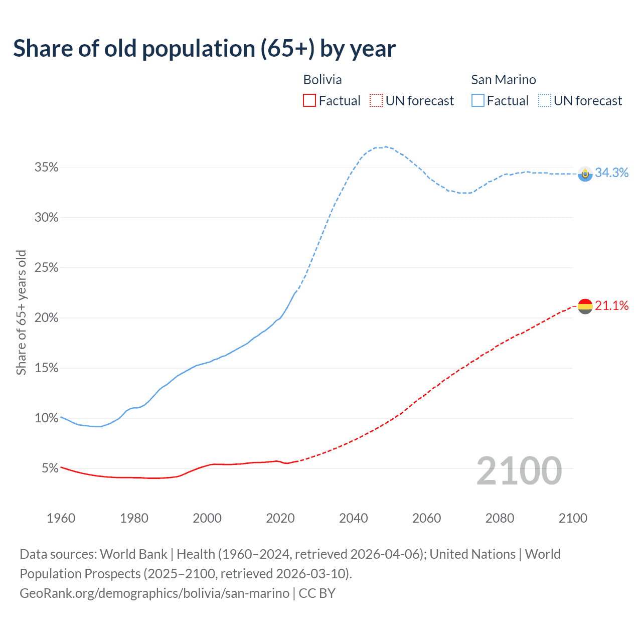 The share of older people aged 65 and over is 5.64% in Bolivia and 22.4% in San Marino. Life expectancy in Bolivia compared to San Marino .
