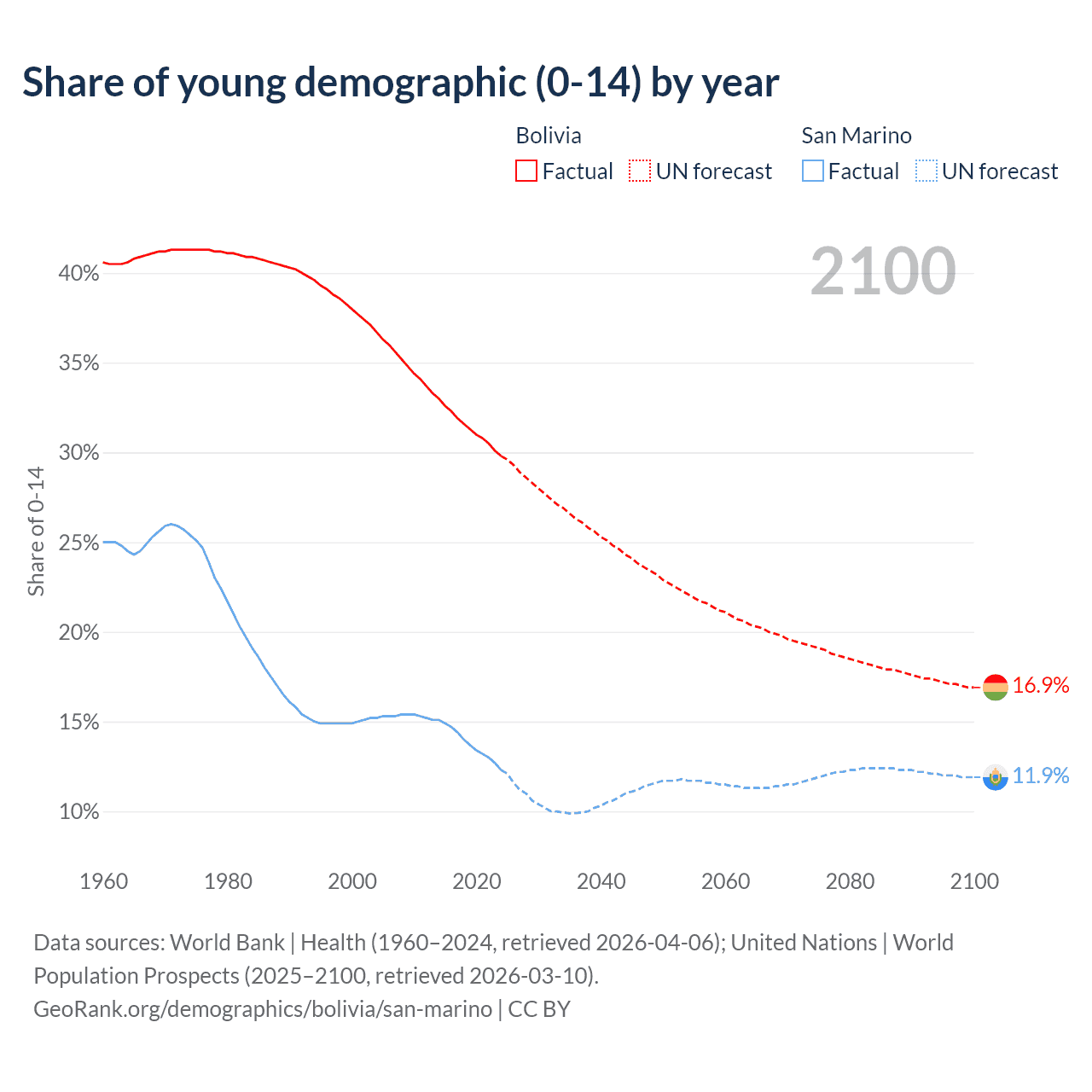 - The share of young demographic (0-15 years old) in Bolivia is 29.8% vs 12.3% in San Marino.