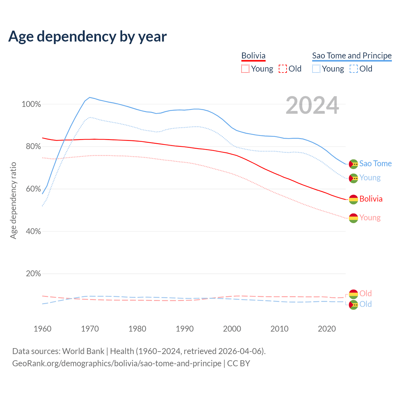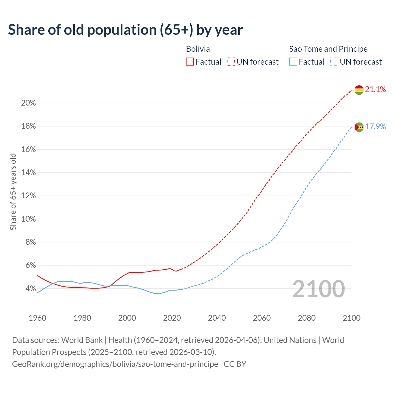 - The share of old-age demographic (65+) in Bolivia is 5.64% vs 3.9% in Sao Tome and Principe.