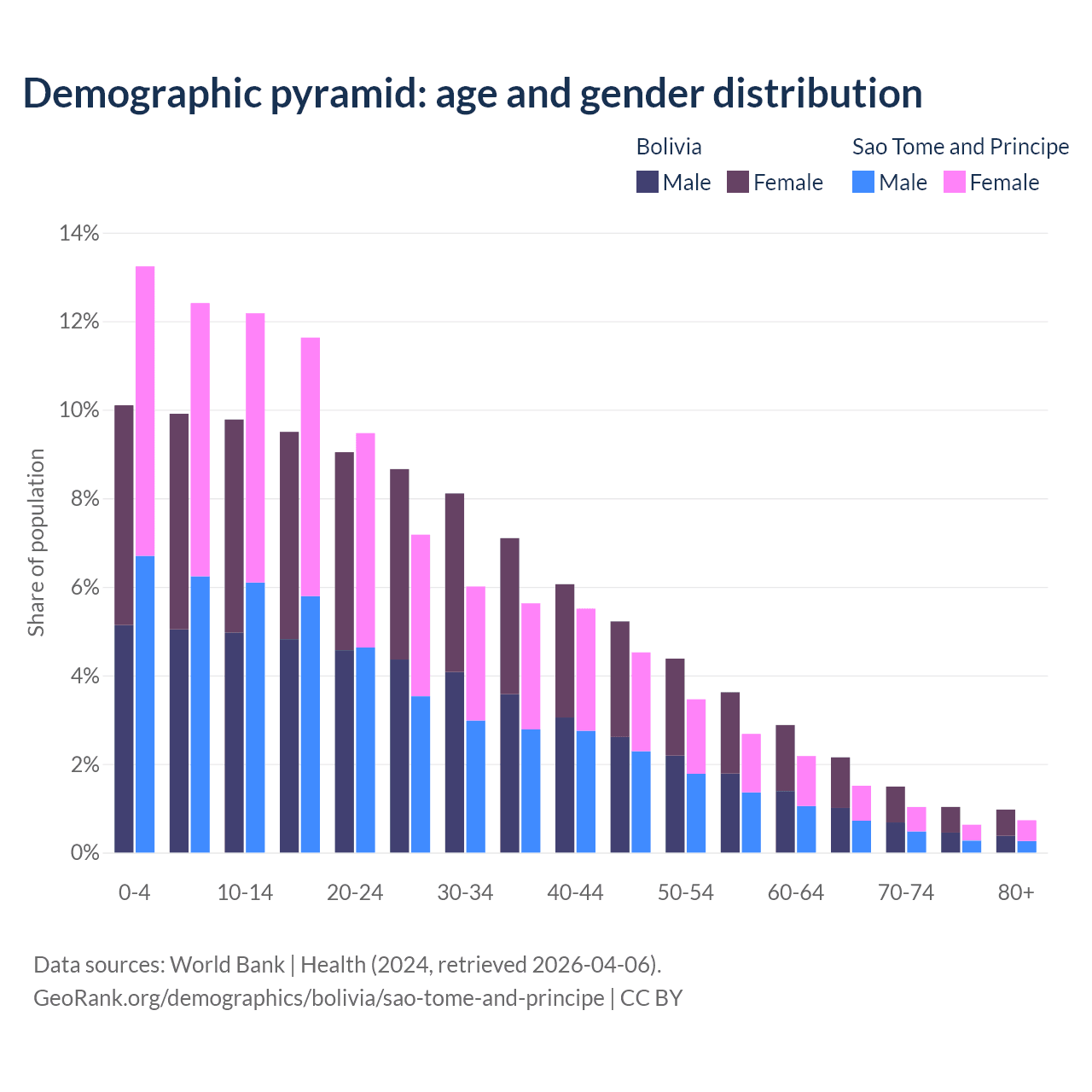 - The share of young demographic (0-15 years old) in Bolivia is 29.8% vs 37.8% in Sao Tome and Principe.