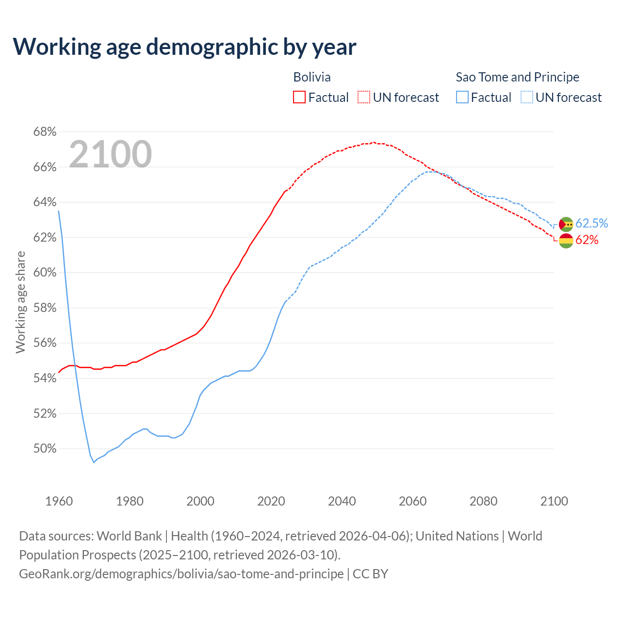 Median age Bolivia vs Sao Tome and Principe, 1960-2100