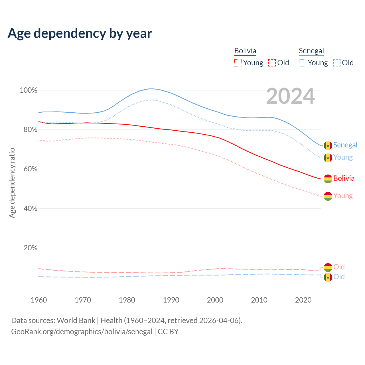 - The share of old-age demographic (65+) in Bolivia is 5.64% vs 3.62% in Senegal.
