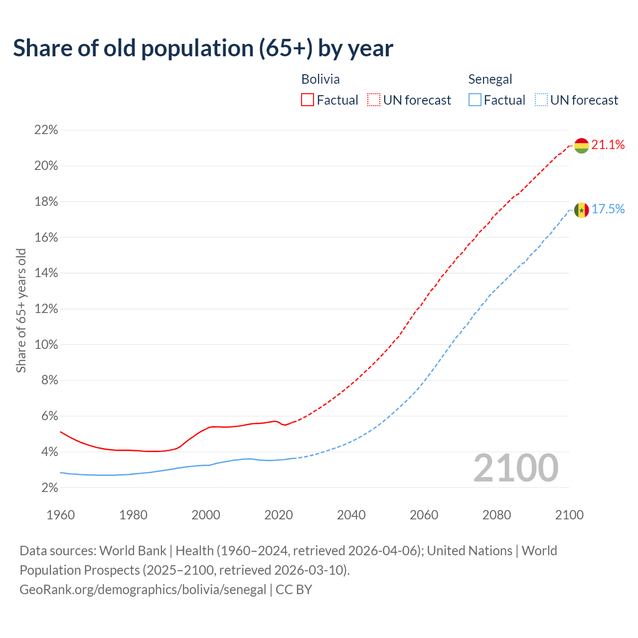 The share of older people aged 65 and over is 5.64% in Bolivia and 3.62% in Senegal. Life expectancy in Bolivia compared to Senegal .