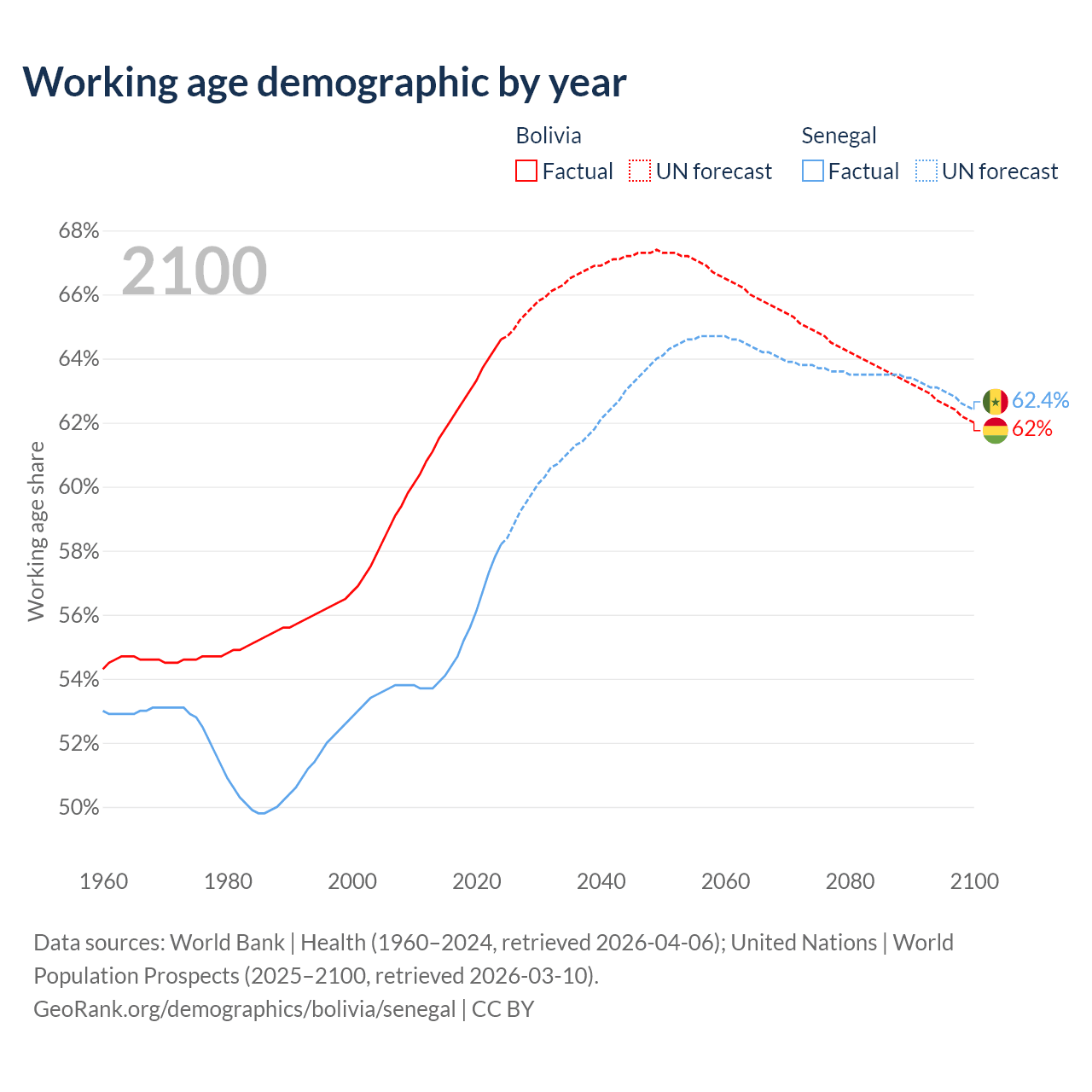 Median age Bolivia vs Senegal, 1960-2100