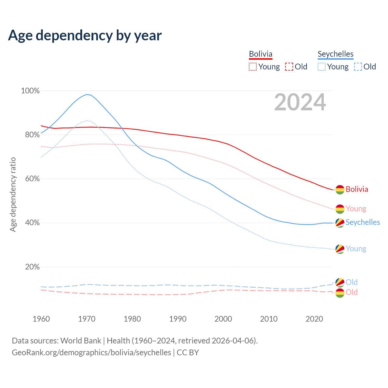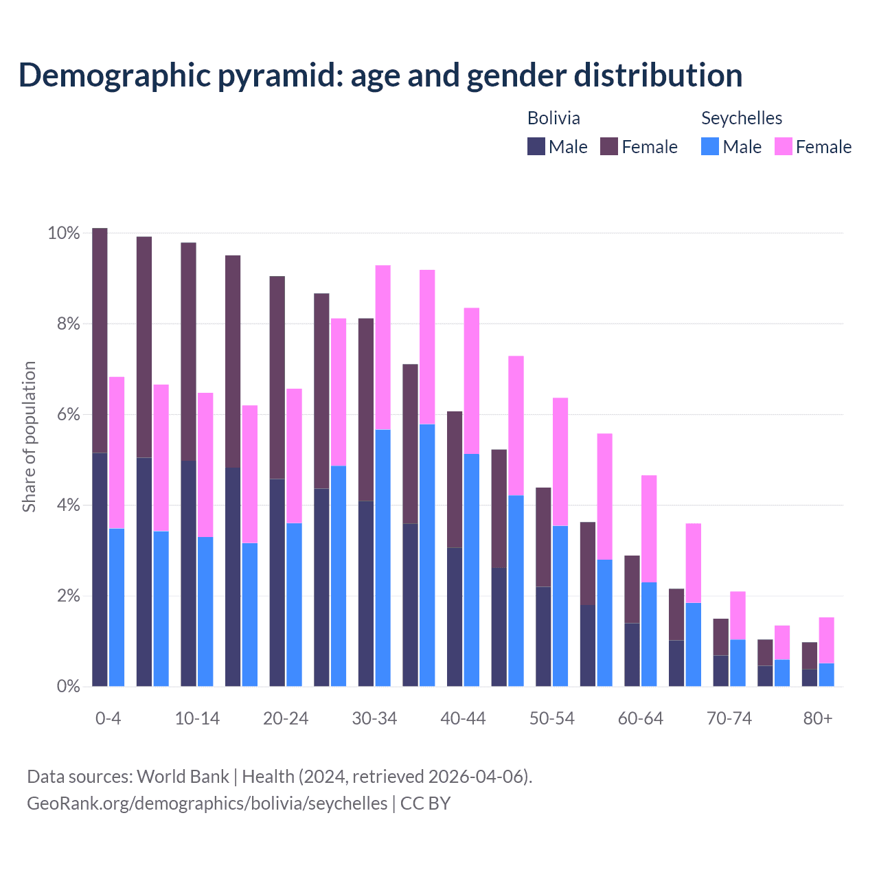 - The share of old-age demographic (65+) in Bolivia is 5.64% vs 8.54% in the Seychelles.