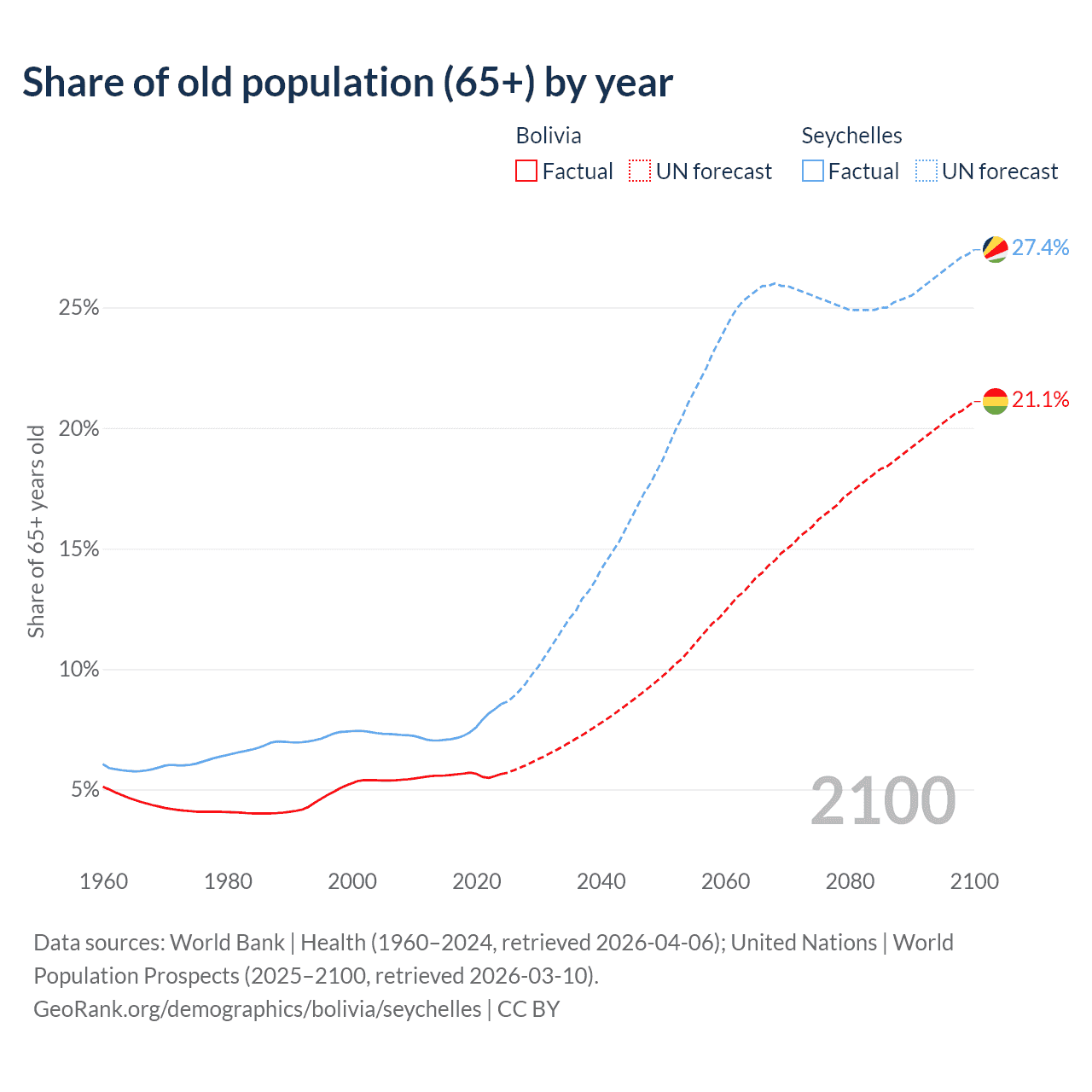 The share of older people aged 65 and over is 5.64% in Bolivia and 8.54% in the Seychelles. Life expectancy in Bolivia compared to the Seychelles .
