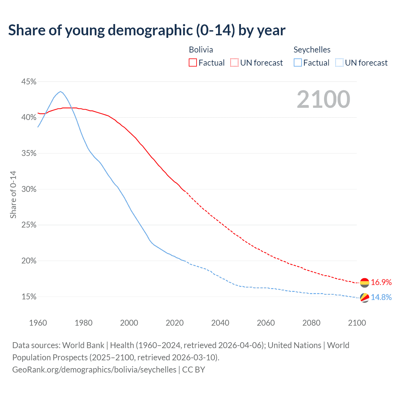 - The share of young demographic (0-15 years old) in Bolivia is 29.8% vs 20% in the Seychelles.