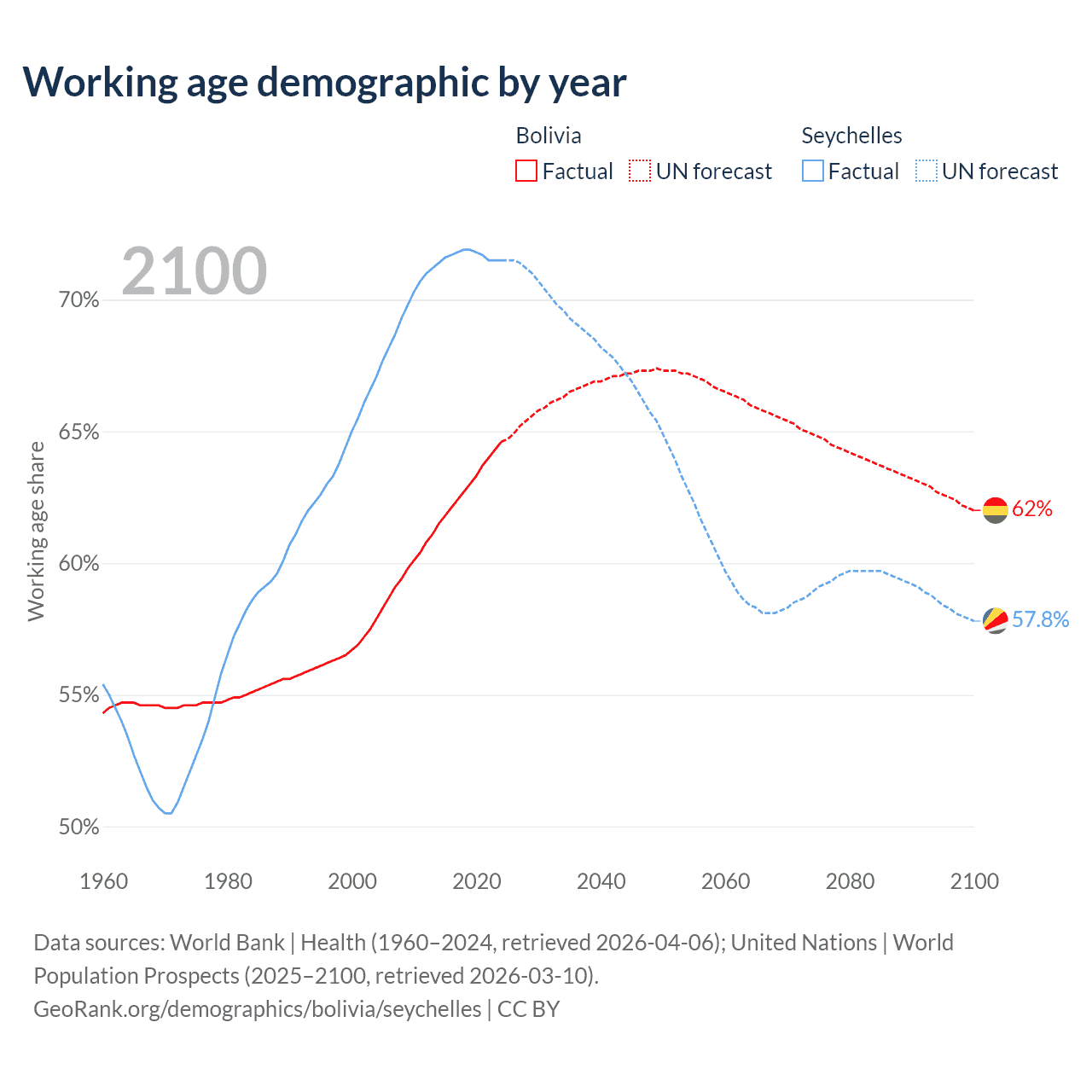 Median age Bolivia vs Seychelles, 1960-2100