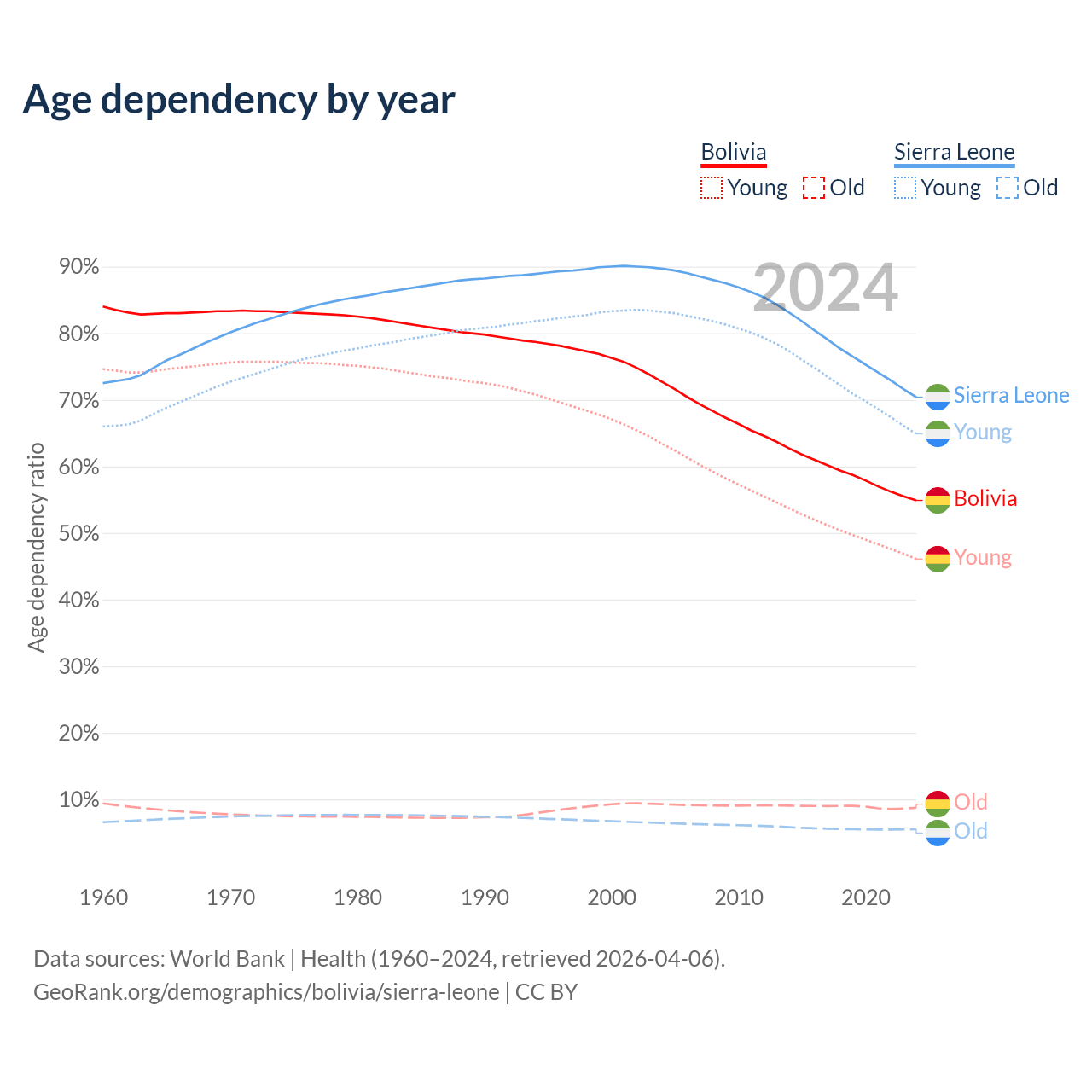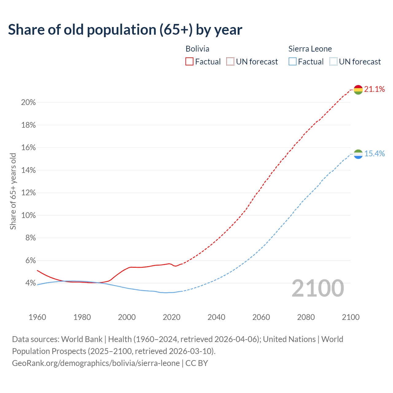 - The share of old-age demographic (65+) in Bolivia is 5.64% vs 3.24% in Sierra Leone.