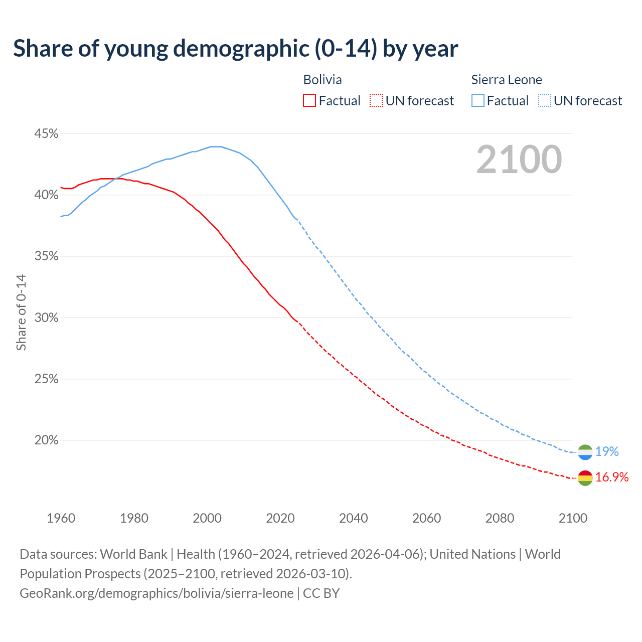 - The share of young demographic (0-15 years old) in Bolivia is 29.8% vs 38.1% in Sierra Leone.