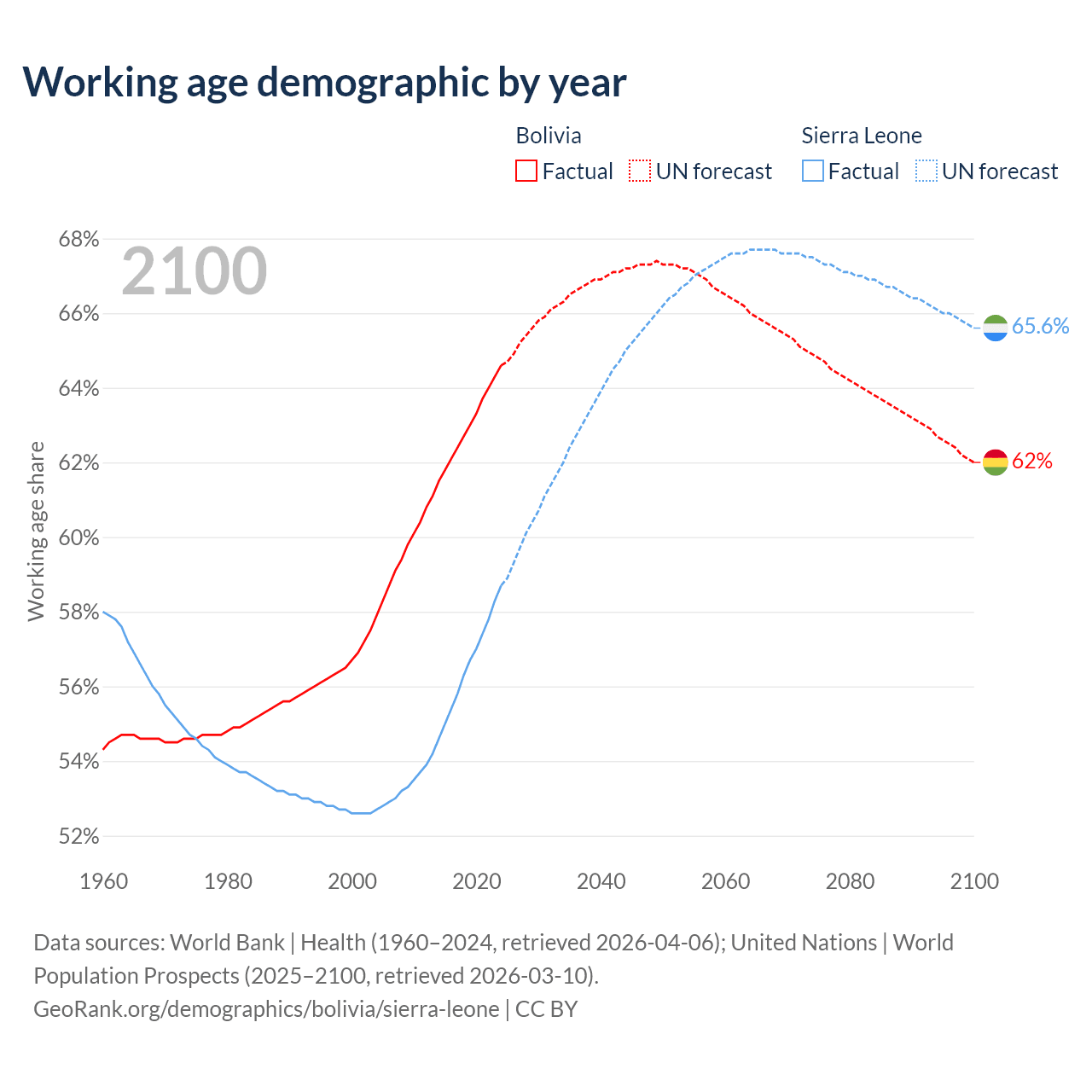 - Bolivia has 8.26M working age adults (aged 15-64) vs 5.31M in Sierra Leone.