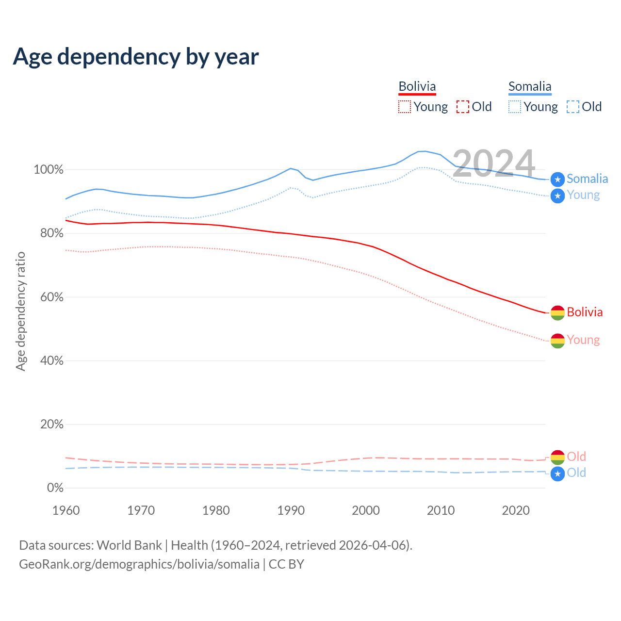 - The share of old-age demographic (65+) in Bolivia is 5.64% vs 2.59% in Somalia.