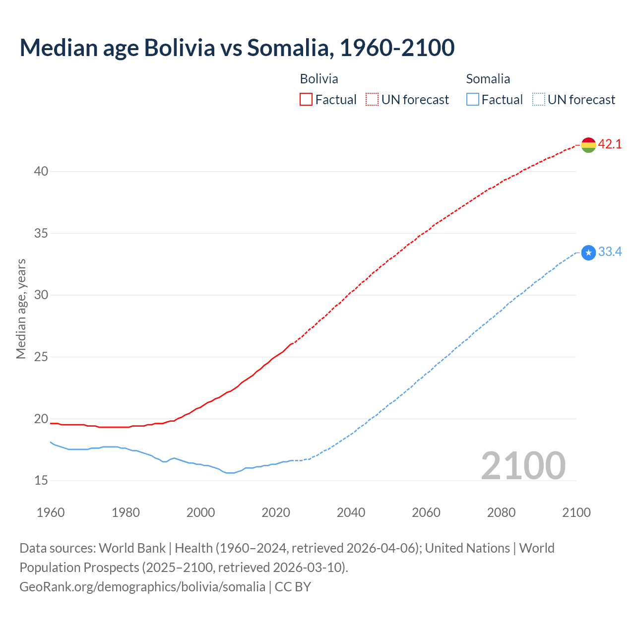 - Bolivia is ranked 128/196 by median age (oldest to youngest) vs 194/196 for Somalia.
