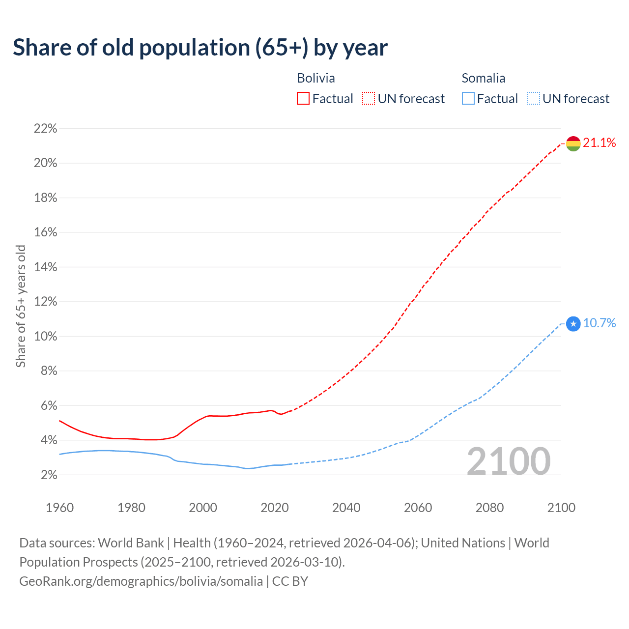 The share of older people aged 65 and over is 5.64% in Bolivia and 2.59% in Somalia. Life expectancy in Bolivia compared to Somalia .