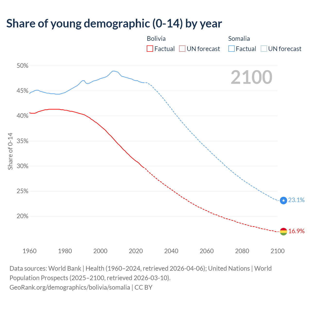 - The share of young demographic (0-15 years old) in Bolivia is 29.8% vs 46.6% in Somalia.