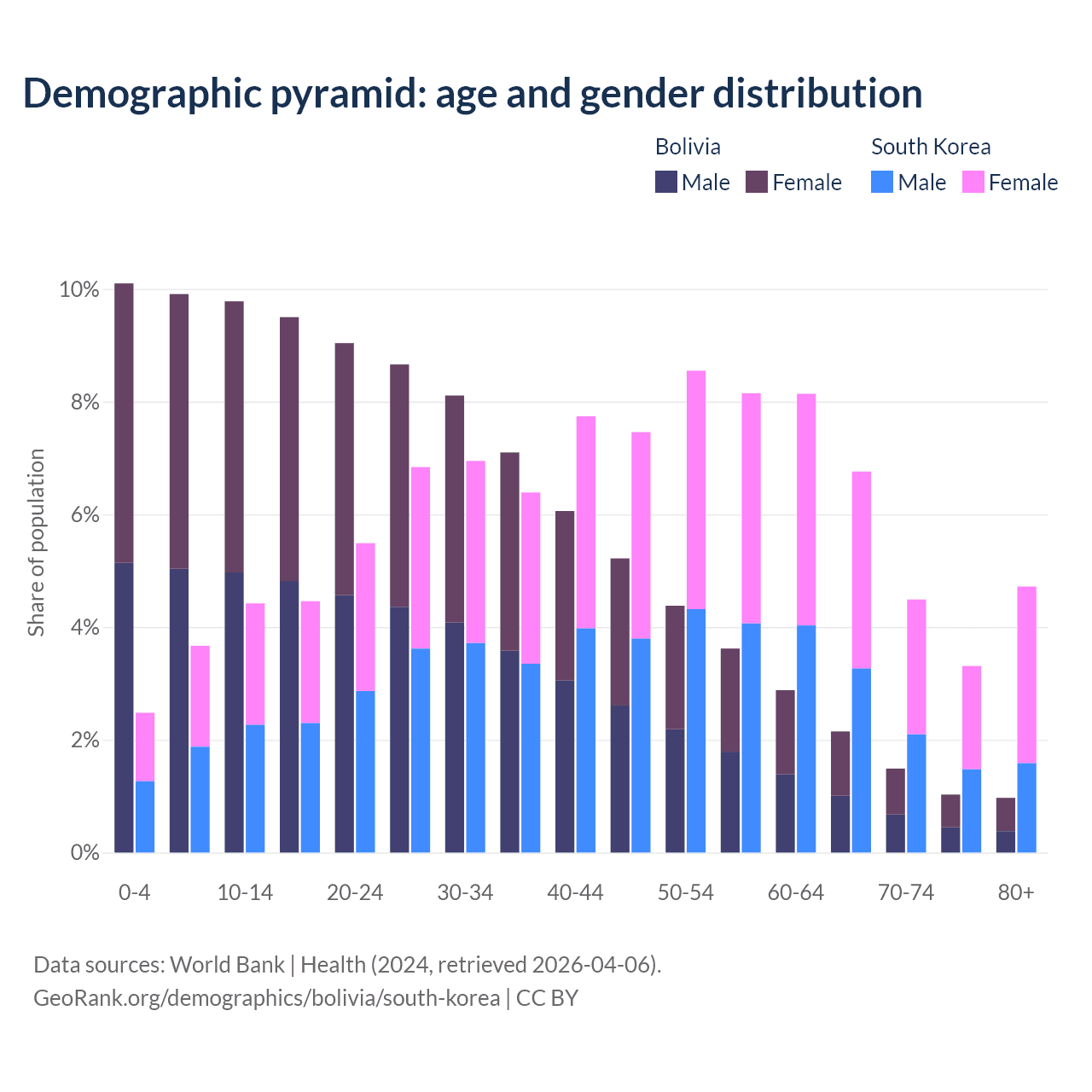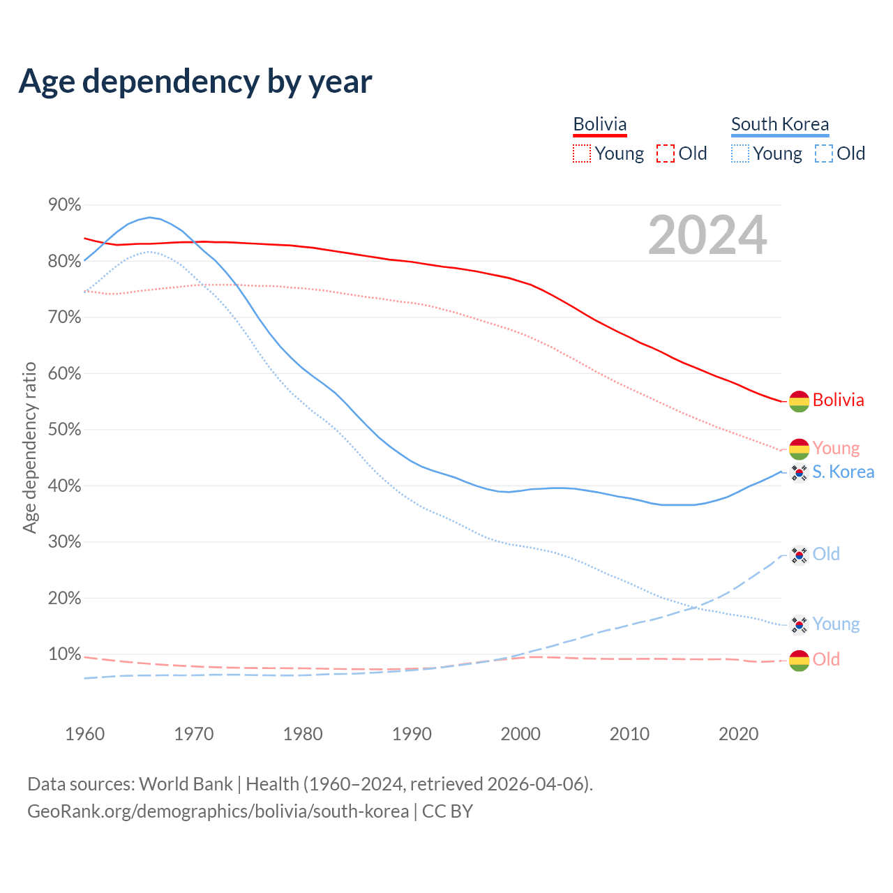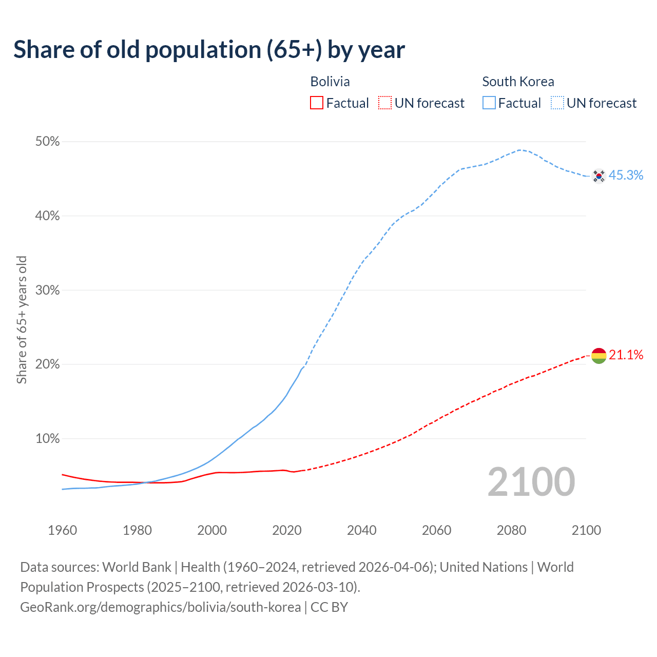 The share of older people aged 65 and over is 5.64% in Bolivia and 19.3% in South Korea. Life expectancy in Bolivia compared to South Korea .