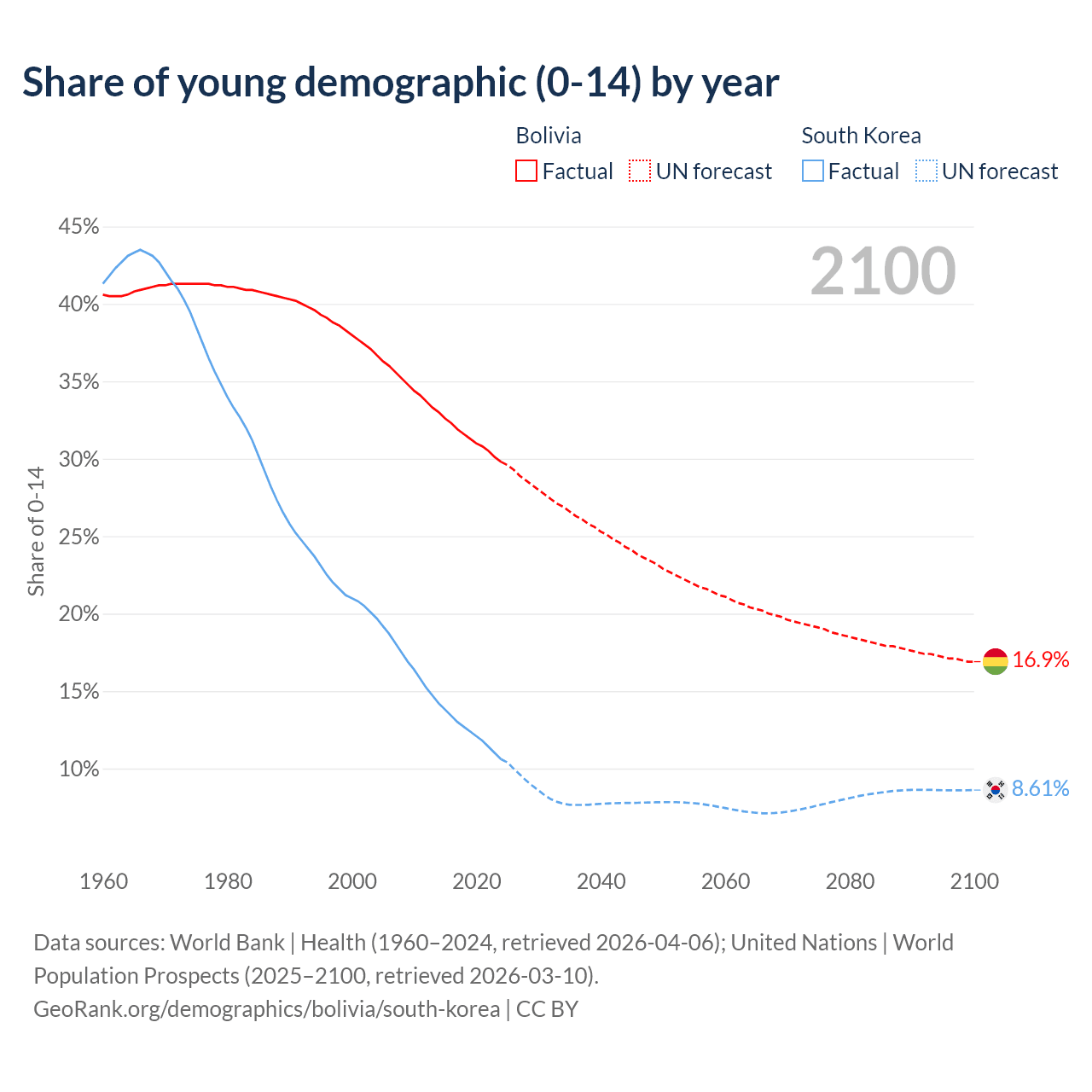 - The share of young demographic (0-15 years old) in Bolivia is 29.8% vs 10.6% in South Korea.
