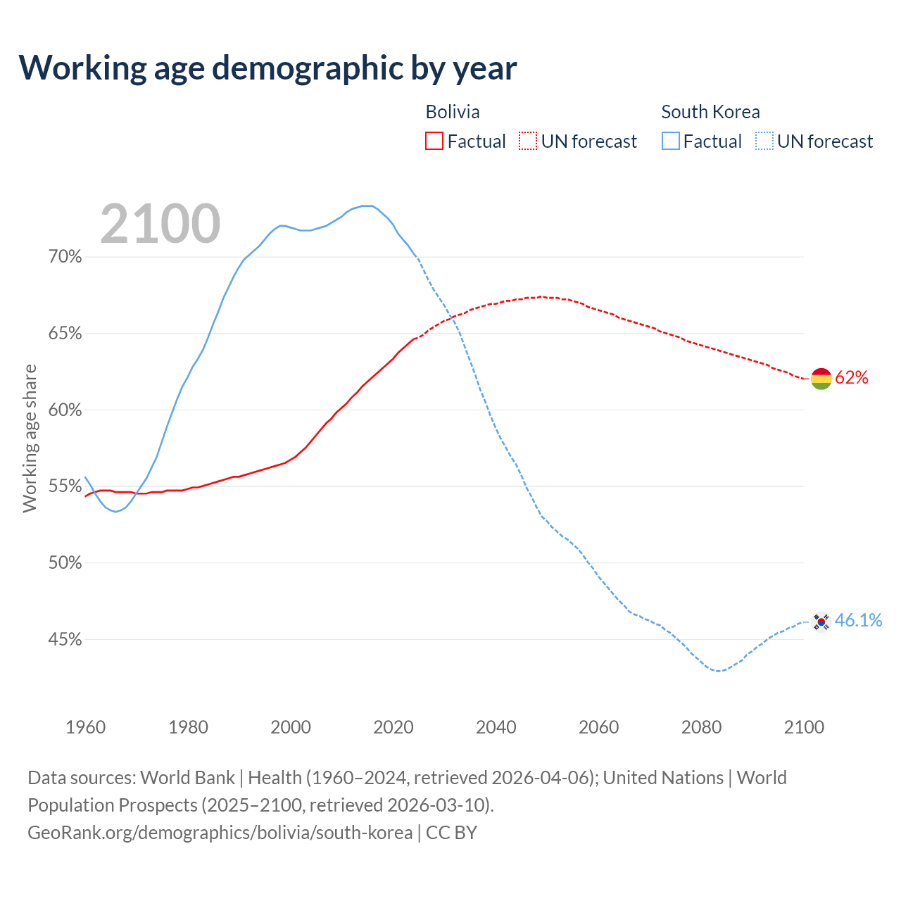 Median age Bolivia vs South Korea, 1960-2100