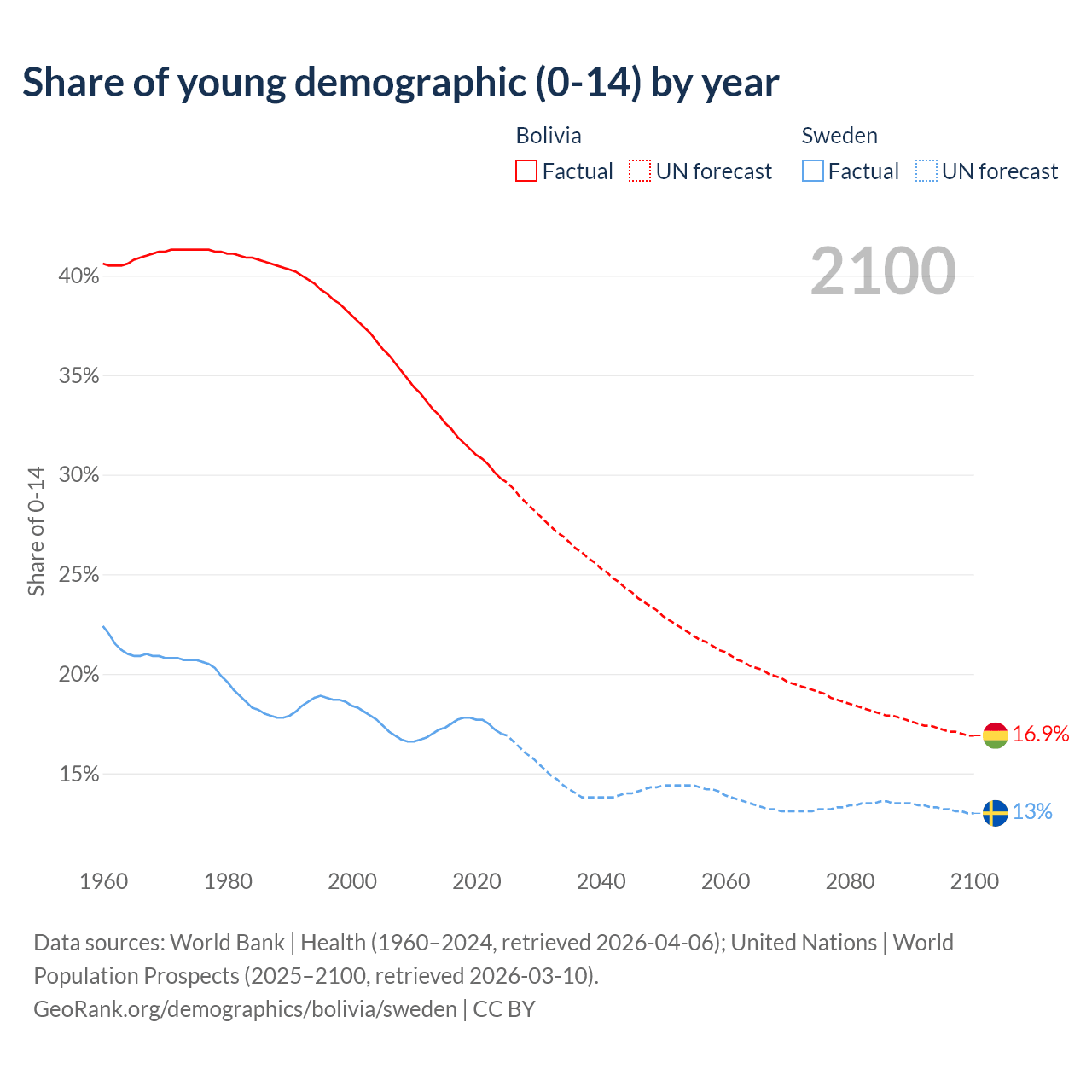- The share of young demographic (0-15 years old) in Bolivia is 29.8% vs 17% in Sweden.