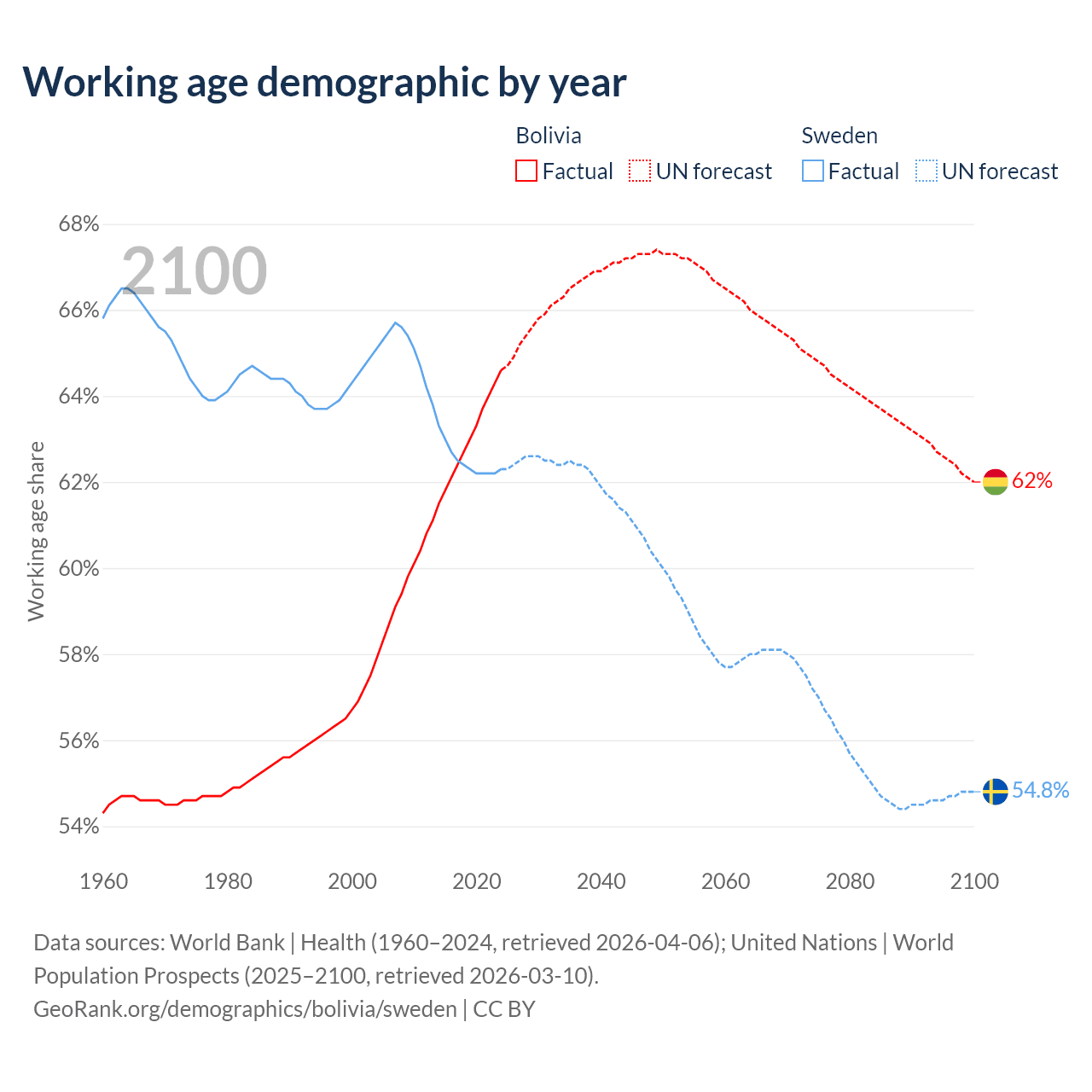 - The share of old-age demographic (65+) in Bolivia is 5.64% vs 20.7% in Sweden.