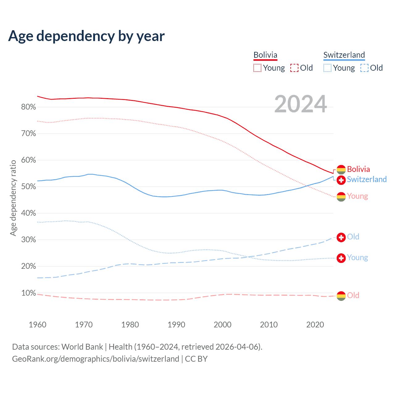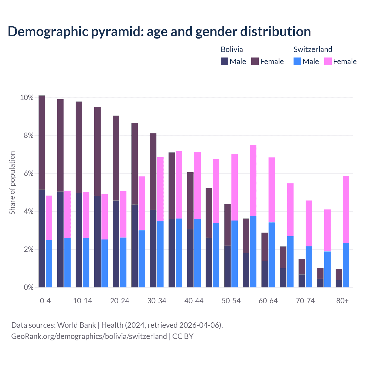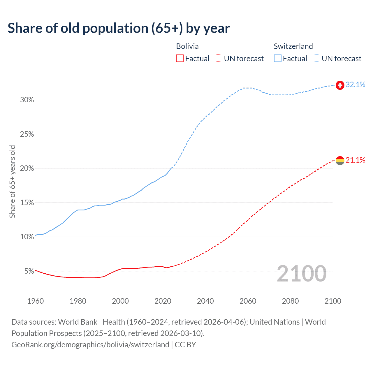 The share of older people aged 65 and over is 5.64% in Bolivia and 20% in Switzerland. Life expectancy in Bolivia compared to Switzerland .