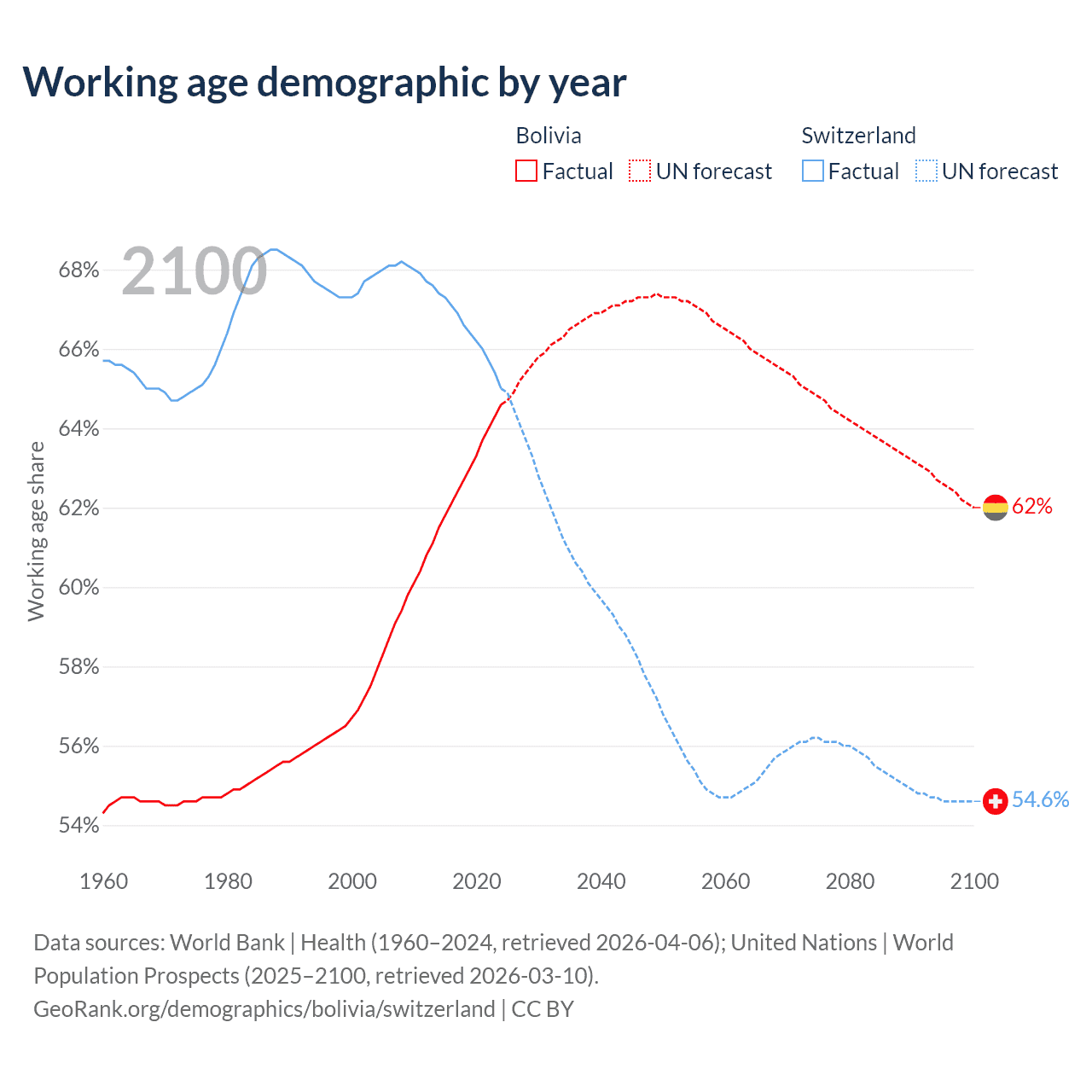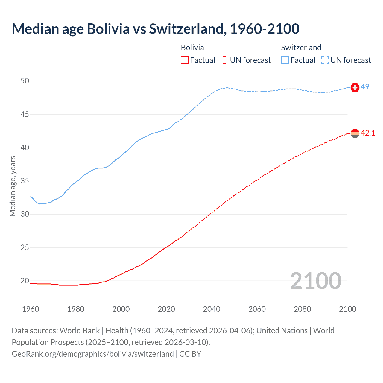 Median age Bolivia vs Switzerland, 1960-2100