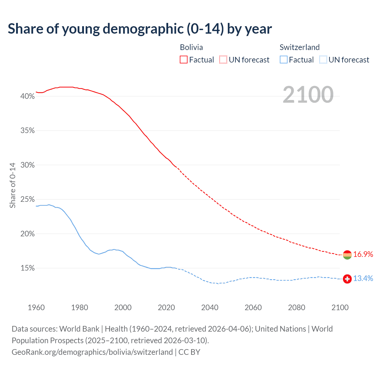 - The share of young demographic (0-15 years old) in Bolivia is 29.8% vs 15% in Switzerland.