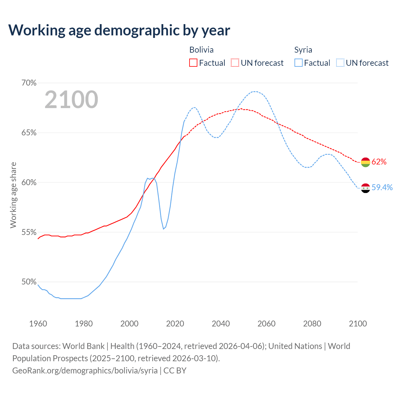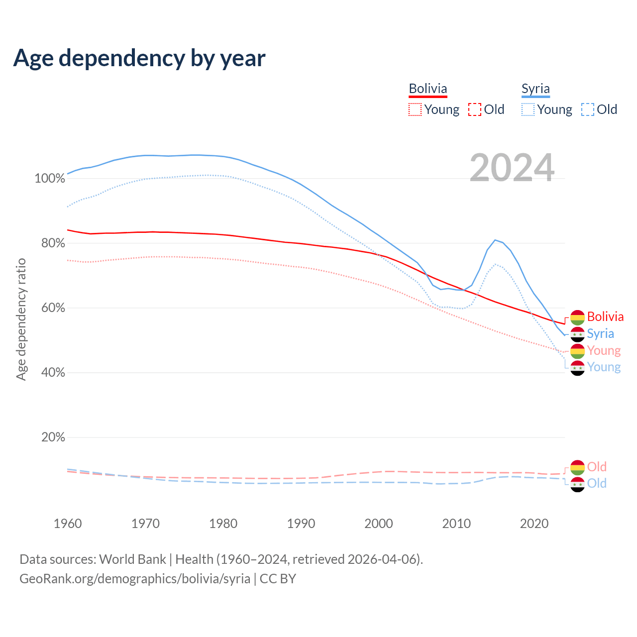 - The share of old-age demographic (65+) in Bolivia is 5.64% vs 4.74% in Syria.