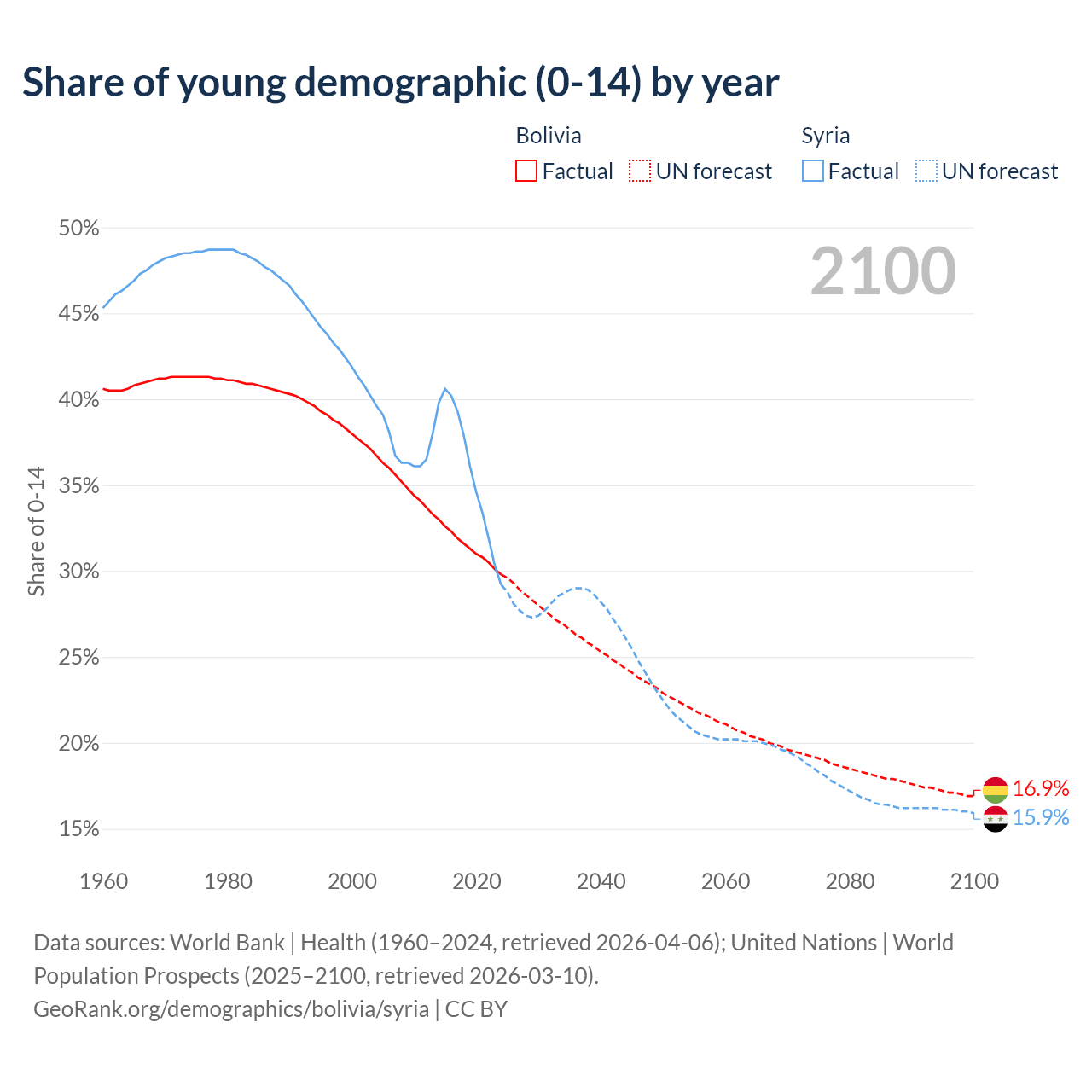 - The share of young demographic (0-15 years old) in Bolivia is 29.8% vs 29.2% in Syria.