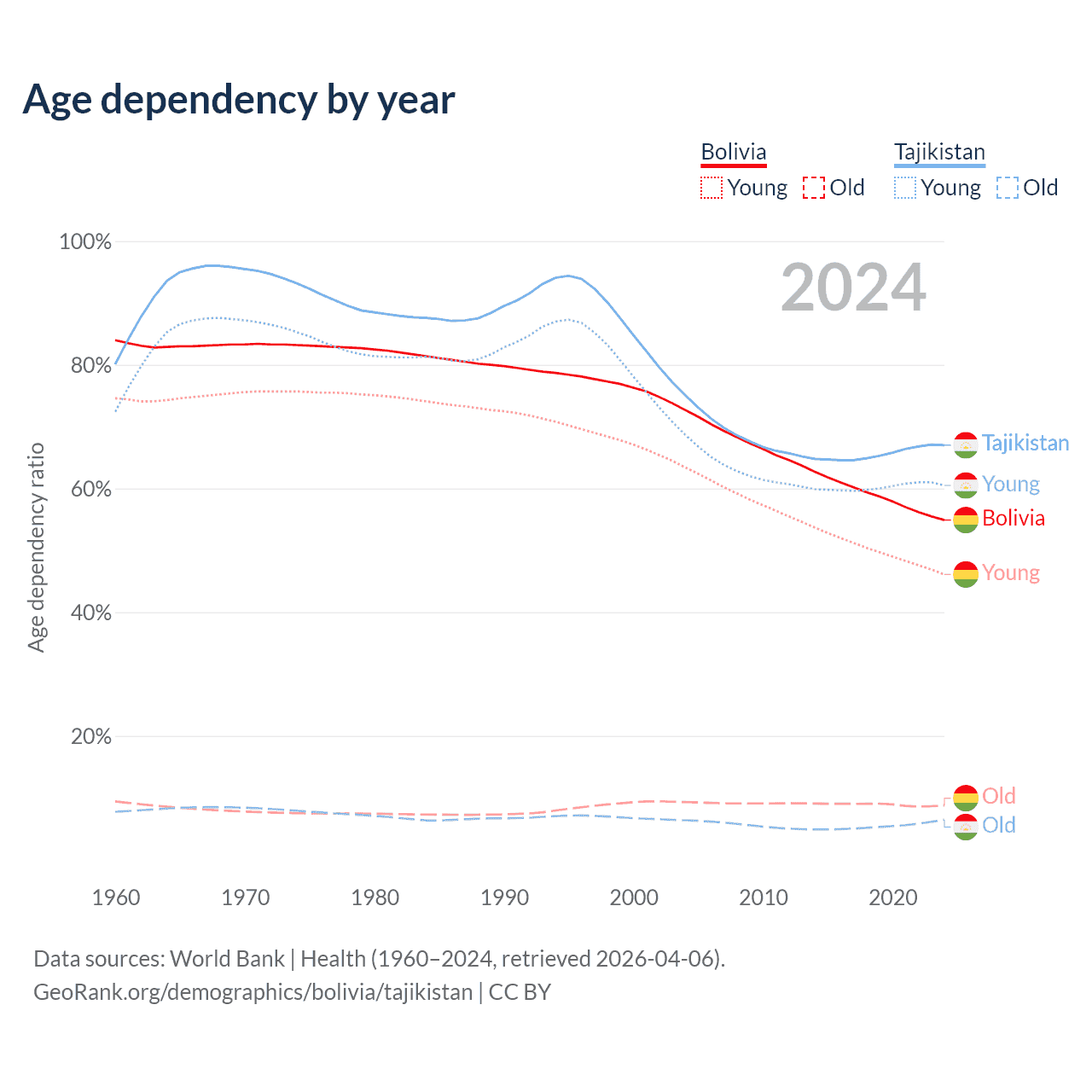 - The share of old-age demographic (65+) in Bolivia is 5.64% vs 3.85% in Tajikistan.