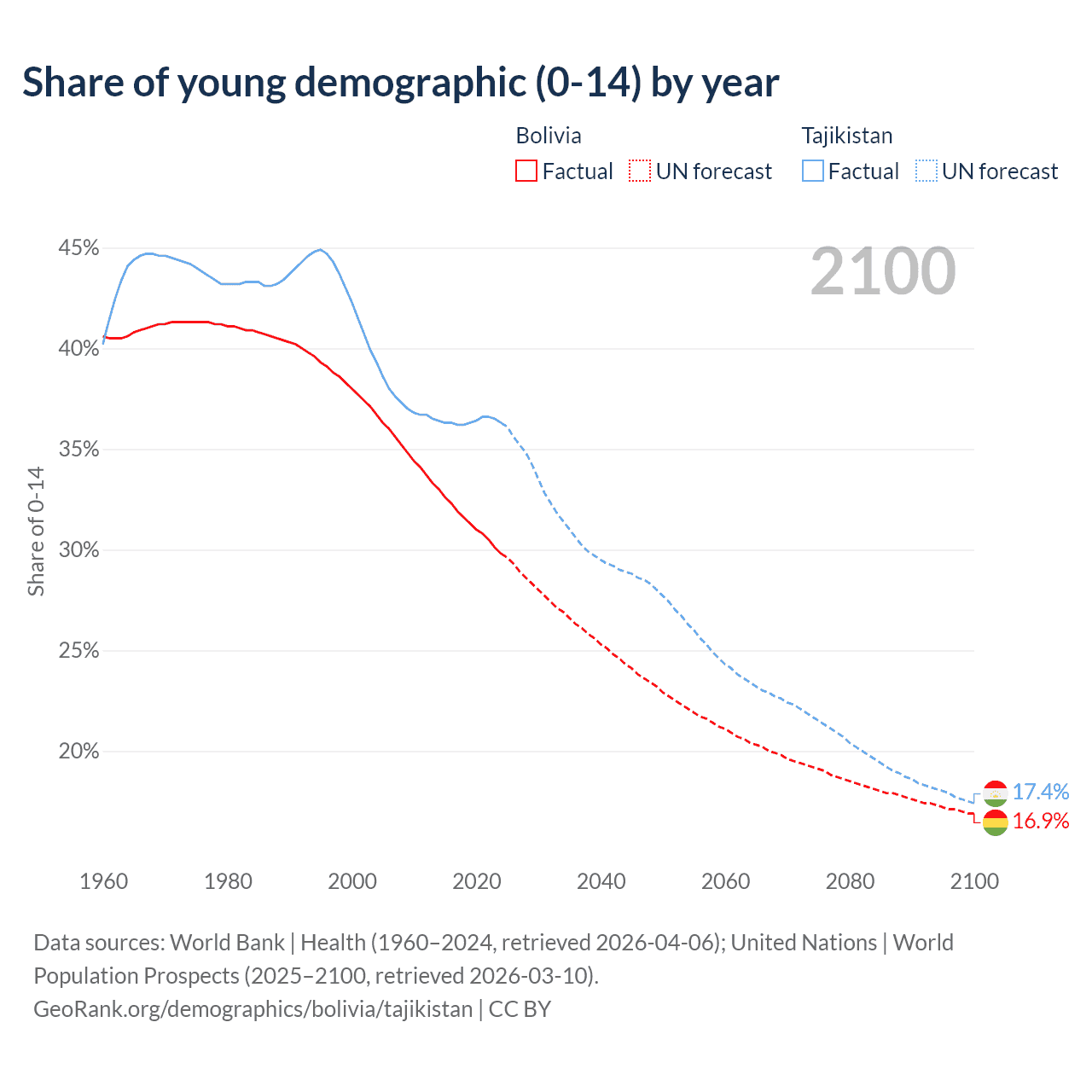 - The share of young demographic (0-15 years old) in Bolivia is 29.8% vs 36.3% in Tajikistan.