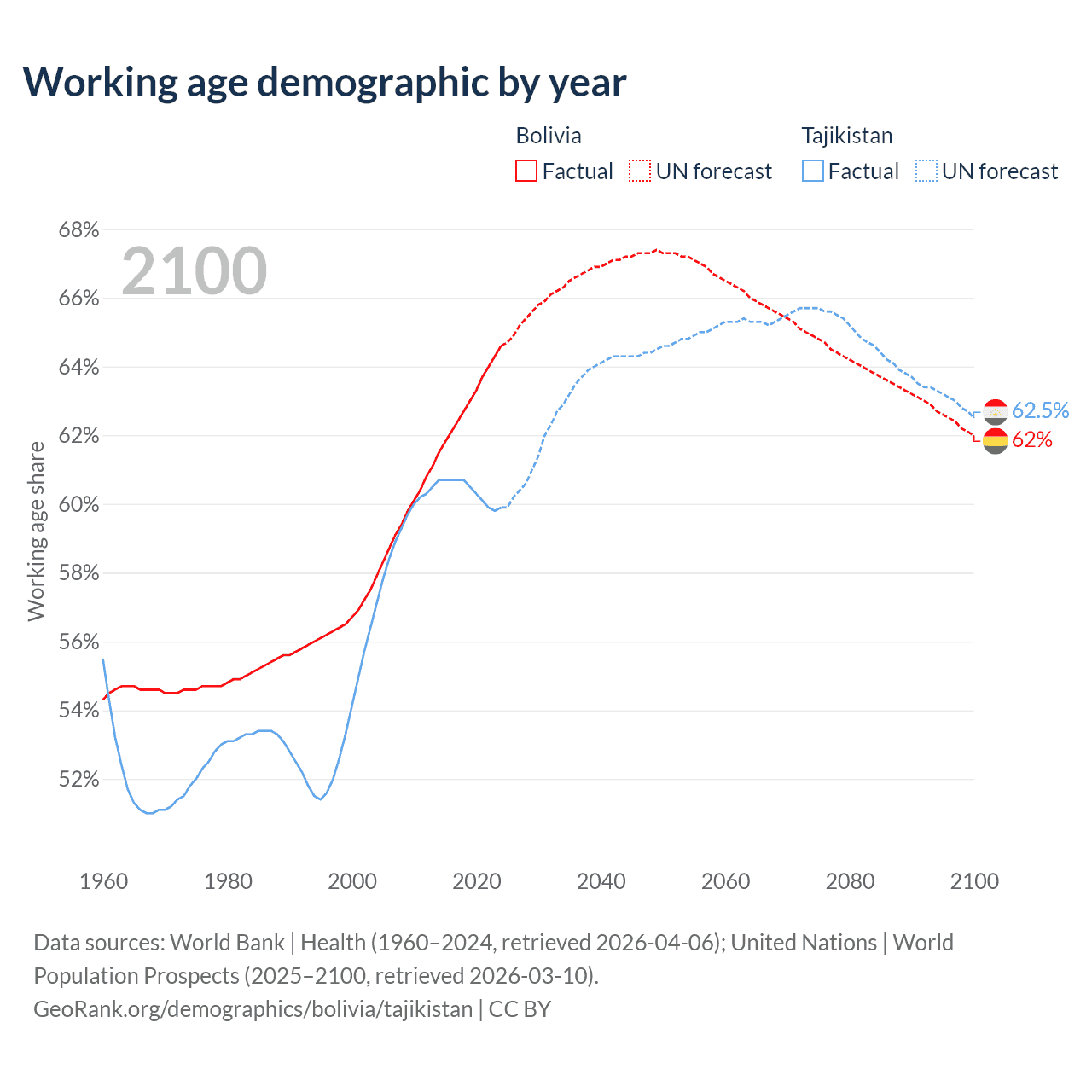 - Bolivia has 8.26M working age adults (aged 15-64) vs 6.61M in Tajikistan.