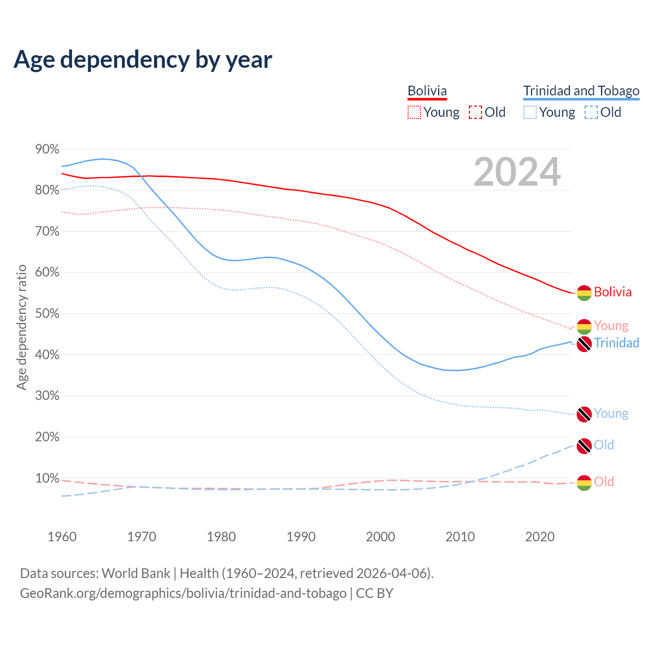 - The share of old-age demographic (65+) in Bolivia is 5.64% vs 12.4% in Trinidad and Tobago.