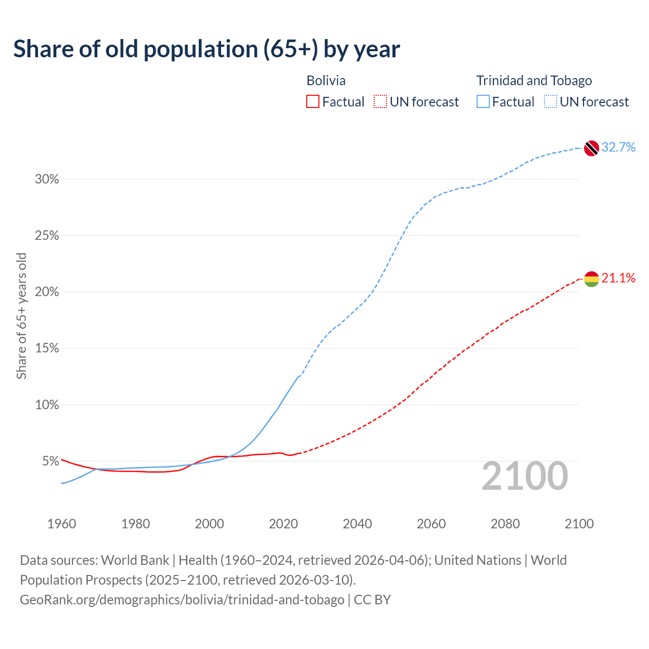 The share of older people aged 65 and over is 5.64% in Bolivia and 12.4% in Trinidad and Tobago. Life expectancy in Bolivia compared to Trinidad and Tobago .