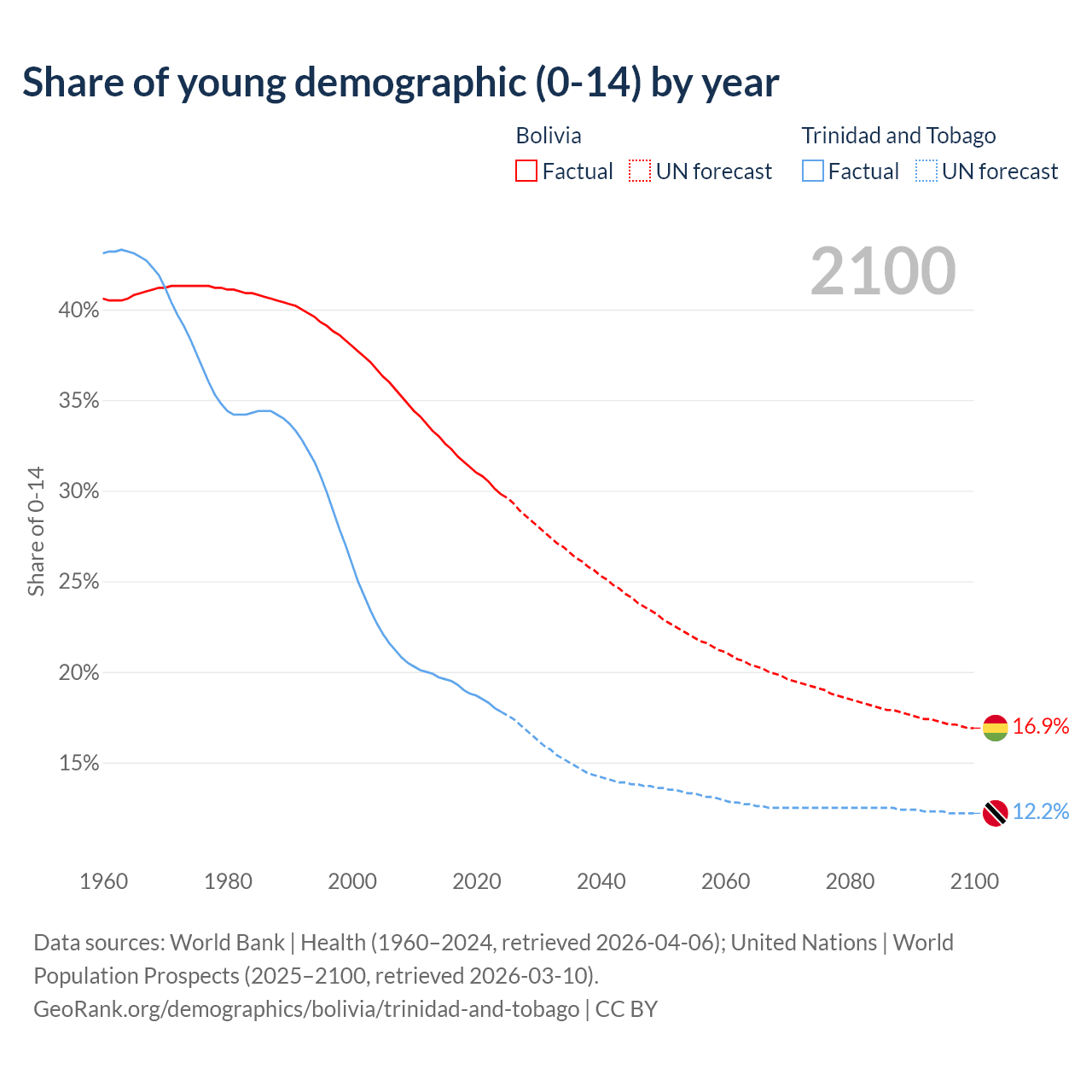 - The share of young demographic (0-15 years old) in Bolivia is 29.8% vs 17.8% in Trinidad and Tobago.
