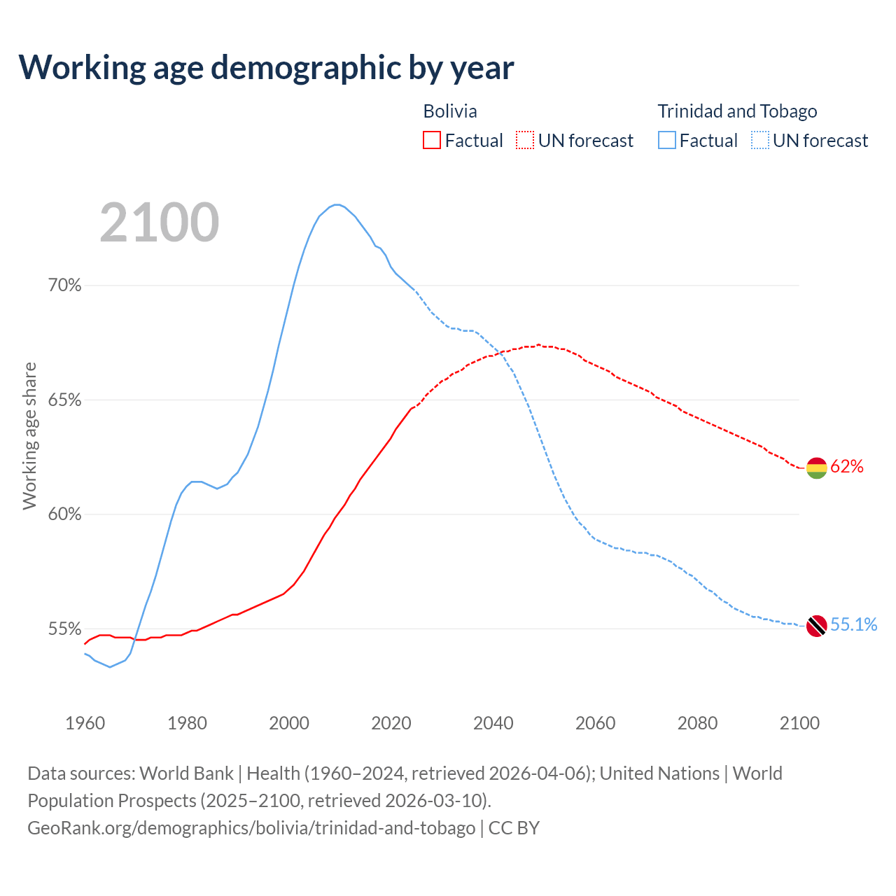 Median age Bolivia vs Trinidad and Tobago, 1960-2100