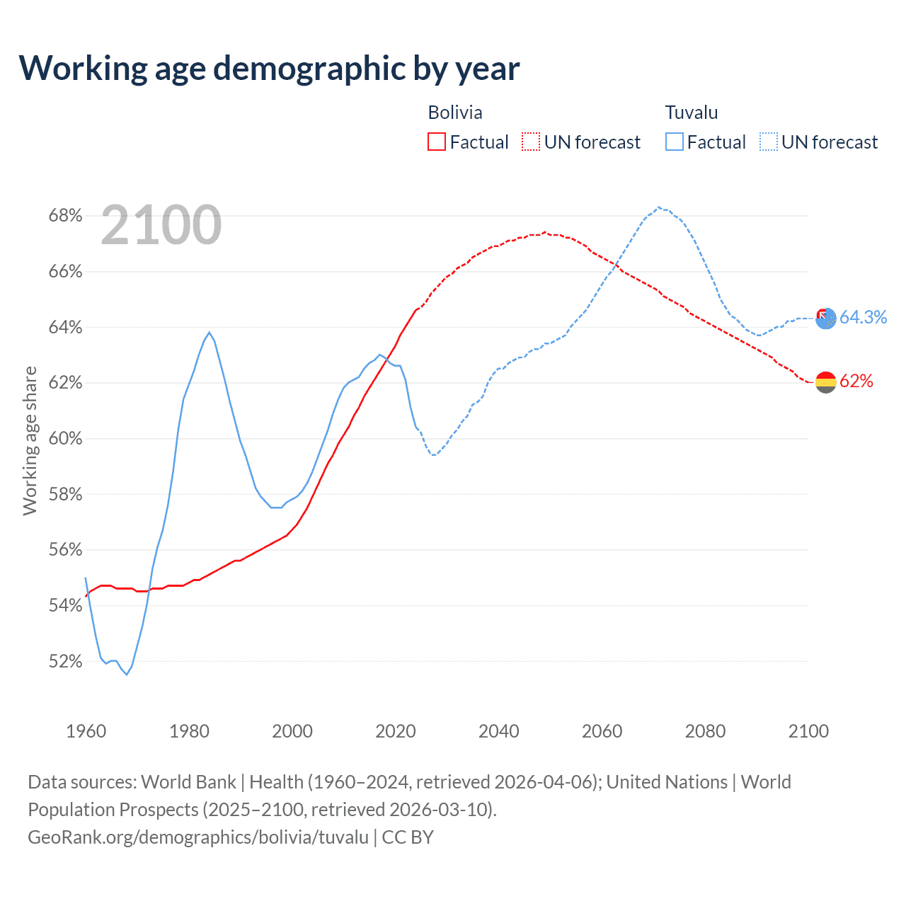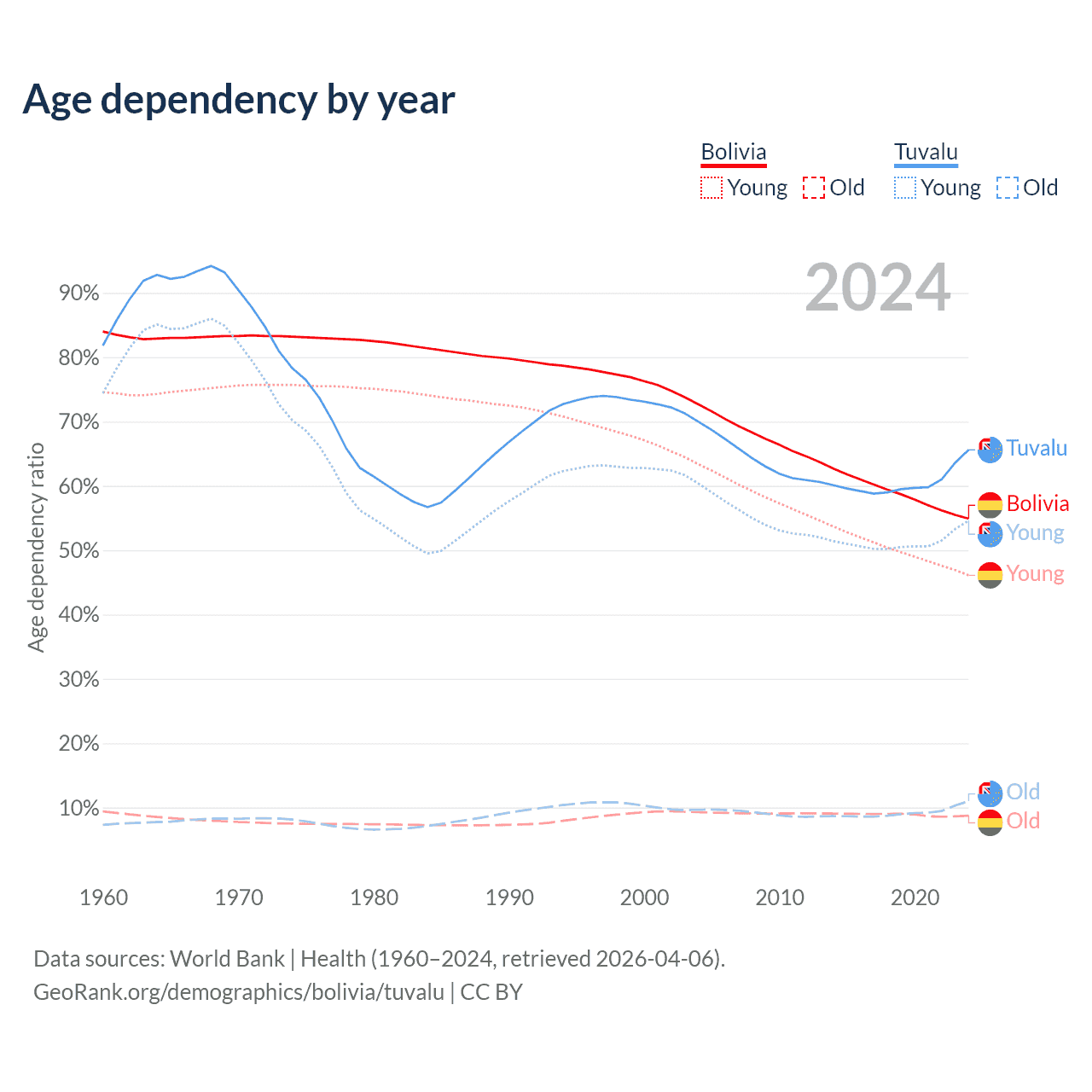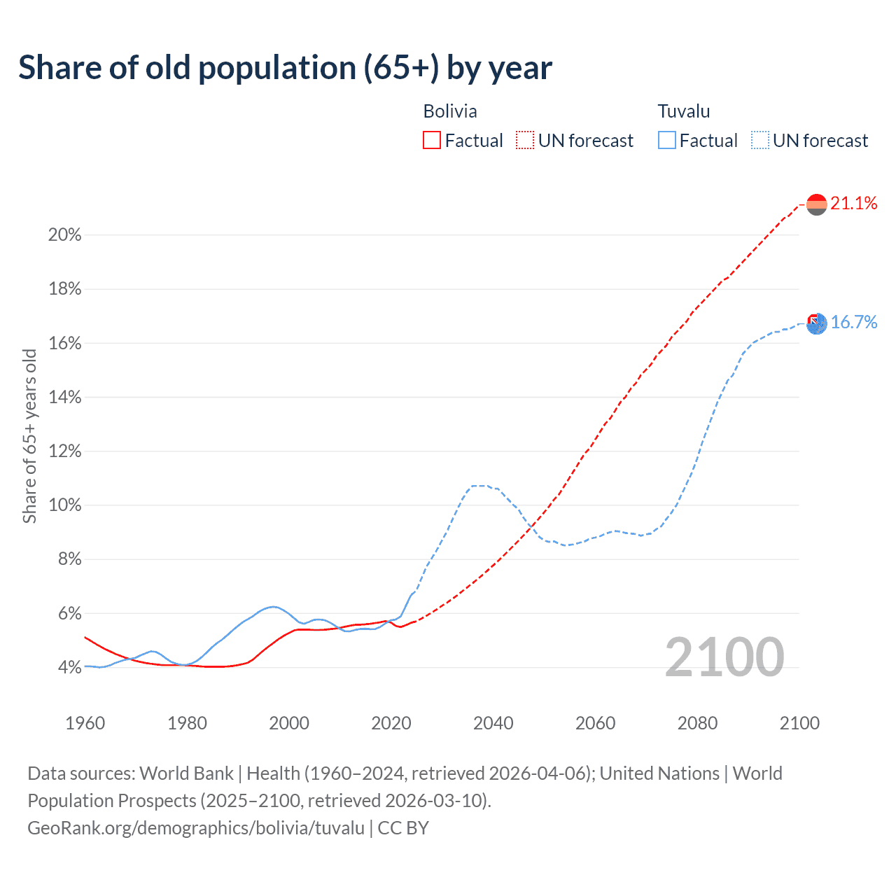 - The share of old-age demographic (65+) in Bolivia is 5.64% vs 6.67% in Tuvalu.