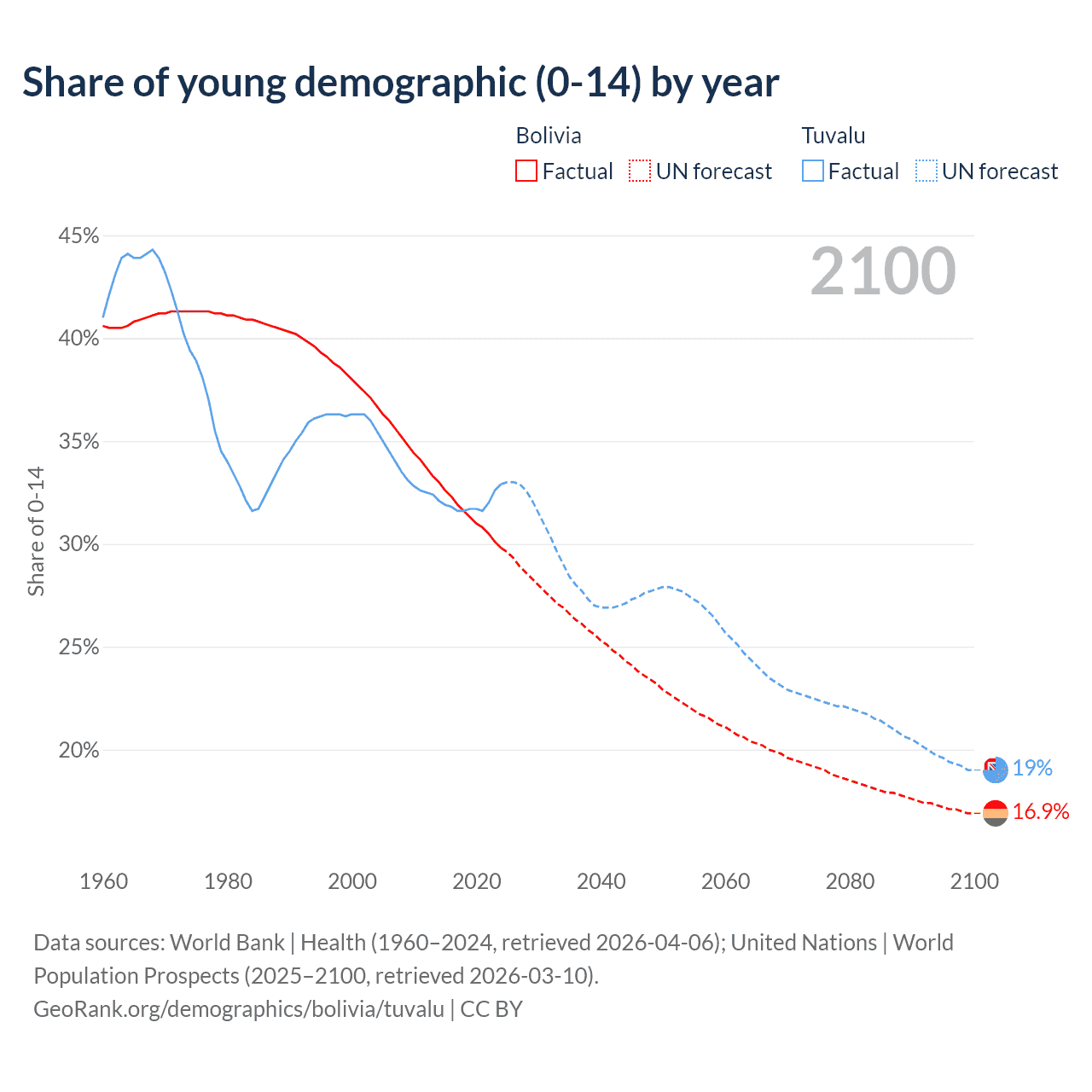 - The share of young demographic (0-15 years old) in Bolivia is 29.8% vs 32.9% in Tuvalu.