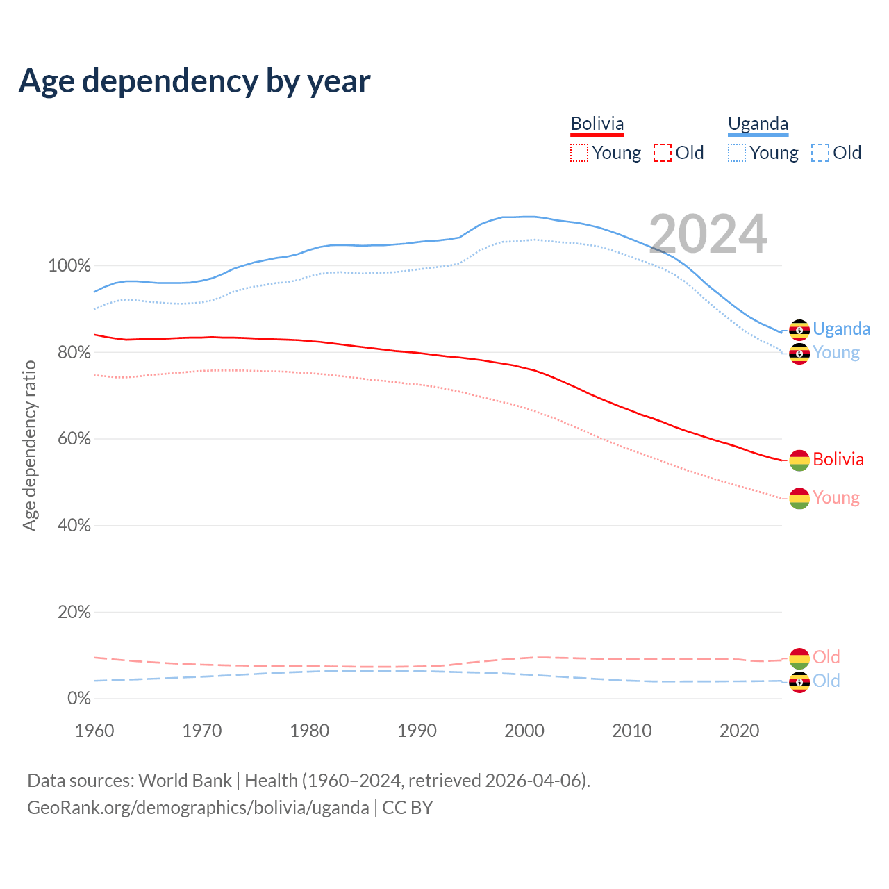 - The share of old-age demographic (65+) in Bolivia is 5.64% vs 2.19% in Uganda.
