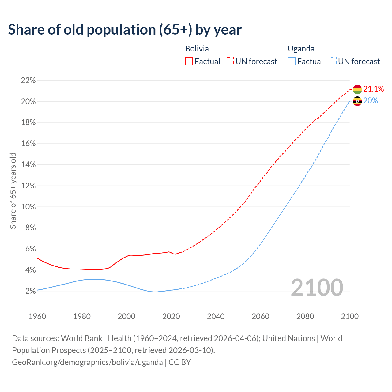 The share of older people aged 65 and over is 5.64% in Bolivia and 2.19% in Uganda. Life expectancy in Bolivia compared to Uganda .