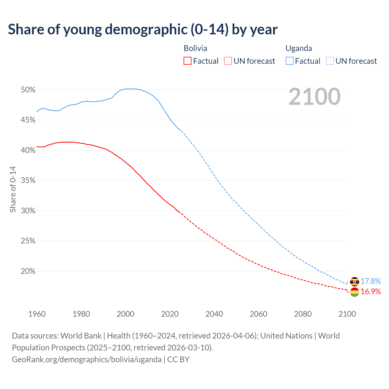 - The share of young demographic (0-15 years old) in Bolivia is 29.8% vs 43.5% in Uganda.