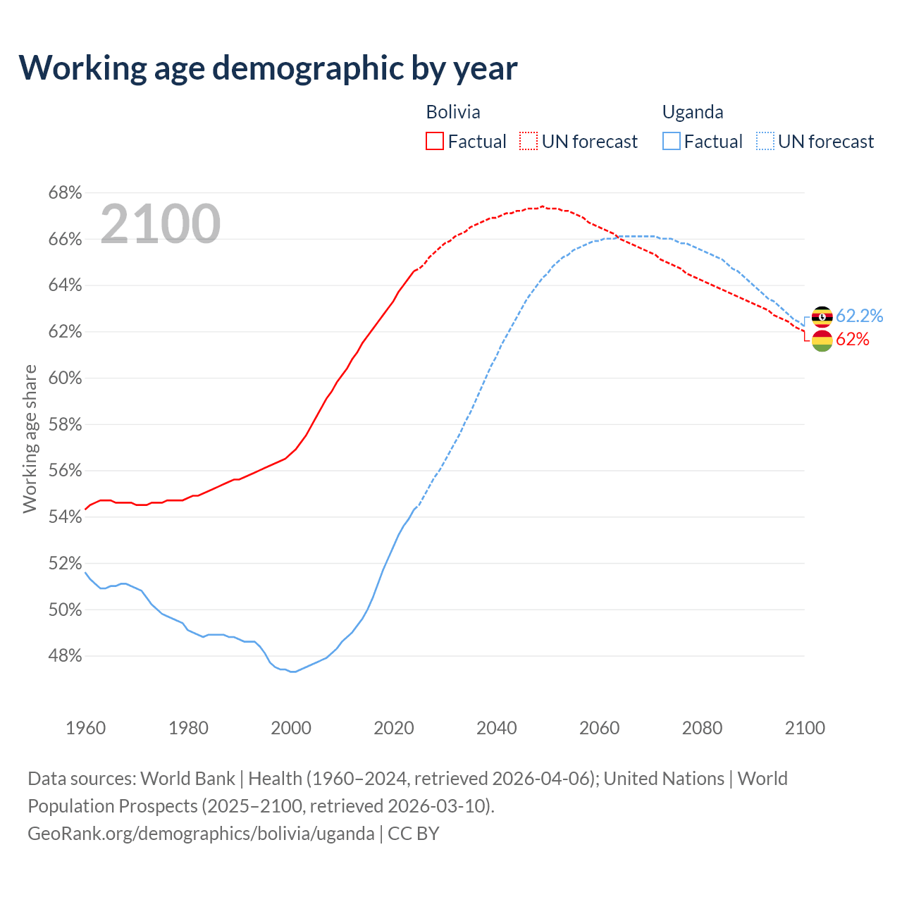 - Bolivia has 8.26M working age adults (aged 15-64) vs 28.9M in Uganda.