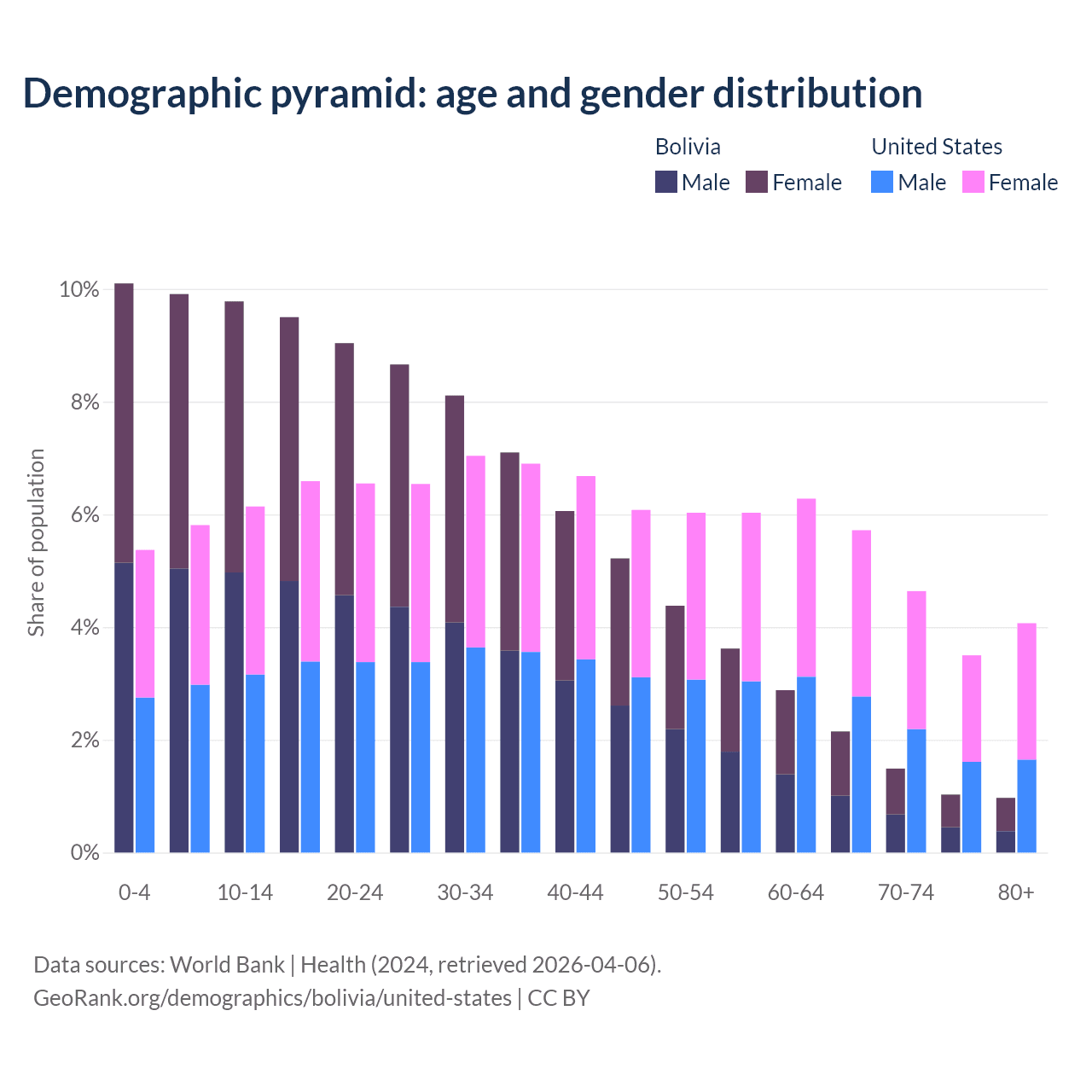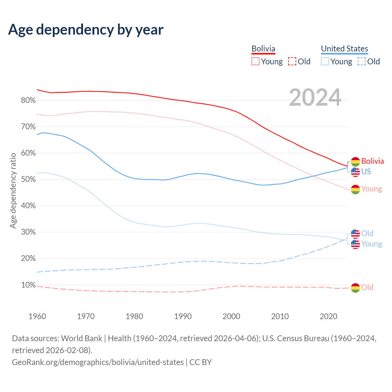 - The share of old-age demographic (65+) in Bolivia is 5.64% vs 17.9% in the United States.