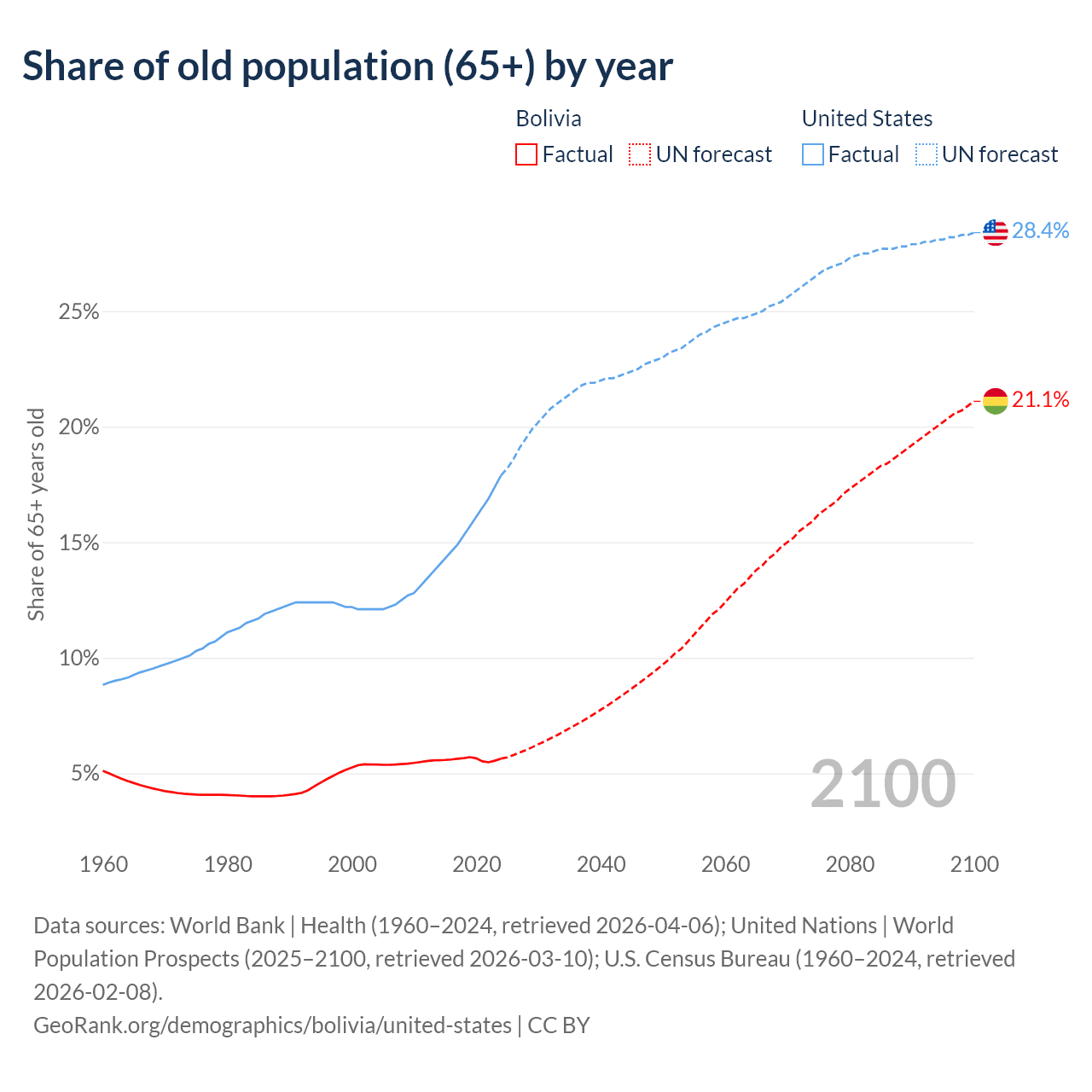 The share of older people aged 65 and over is 5.64% in Bolivia and 17.9% in the United States. Life expectancy in Bolivia compared to the United States .