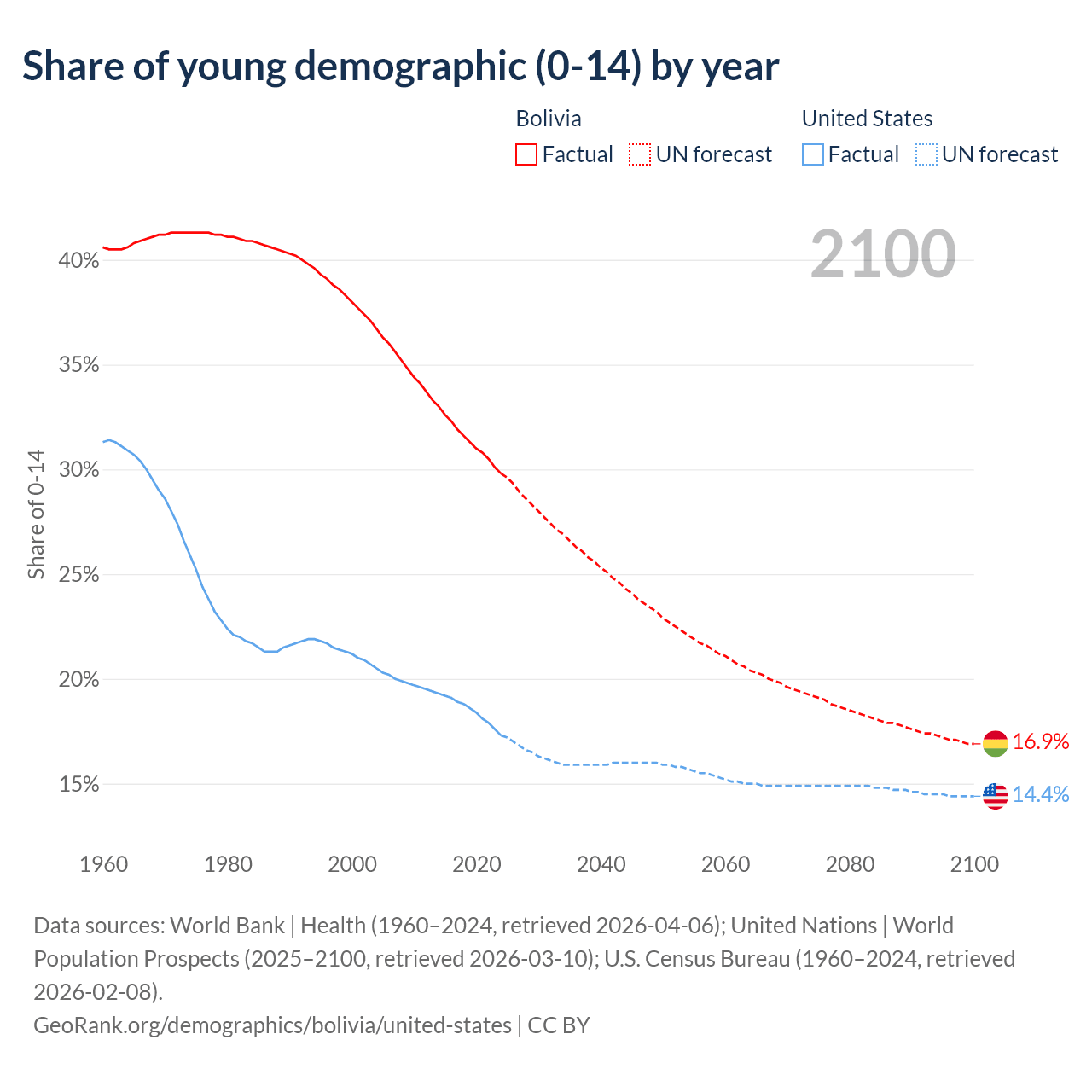 - The share of young demographic (0-15 years old) in Bolivia is 29.8% vs 17.3% in the United States.